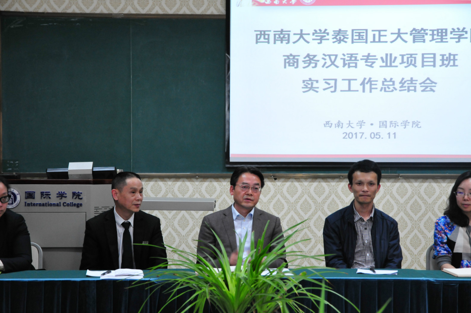 2017年5月11日下午15:00,泰国正大管理学院商务汉语项目班实习工作总结会在伟的国际1946bv泰国文化教室举行,伟的国际1946bv党总支书记刘猛,图书馆副馆长章雷,以及后勤集团接待中心主任肖先勇等相关负责人参加会议。