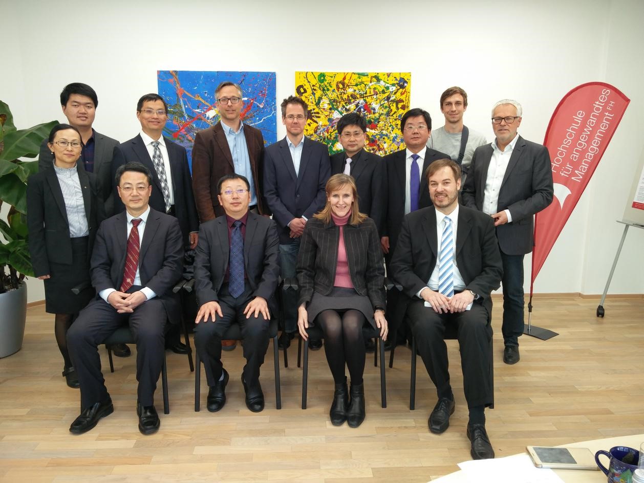 德国应用管理大学是德国巴伐利亚州最大的私立应用技术大学,一共有六个校区。该校 以管理学专业为主,所有本科和硕士专业均得到德国以及欧洲的认证。此外,学校与各类企业和组织紧密合作,将最新的商业趋势与市场潮流纳入其案例教学中。代表团分别与该校国际处主管Pierre Rafih教授,创新与创造力研究院院长Joel Schmidt教授、唐敏教授,公共管理学院院长Ulrich Lenz教授、 Hans-Peter Mayer教授和运动技能管理学院的副院长Tobias Haupt教授等进行了会谈,双方就互派师生进行短期访学等合作内容进行了深入沟通,该校计划于今年6月份向我校派出首批学生,参加我校举办的国际学生夏令营活动。