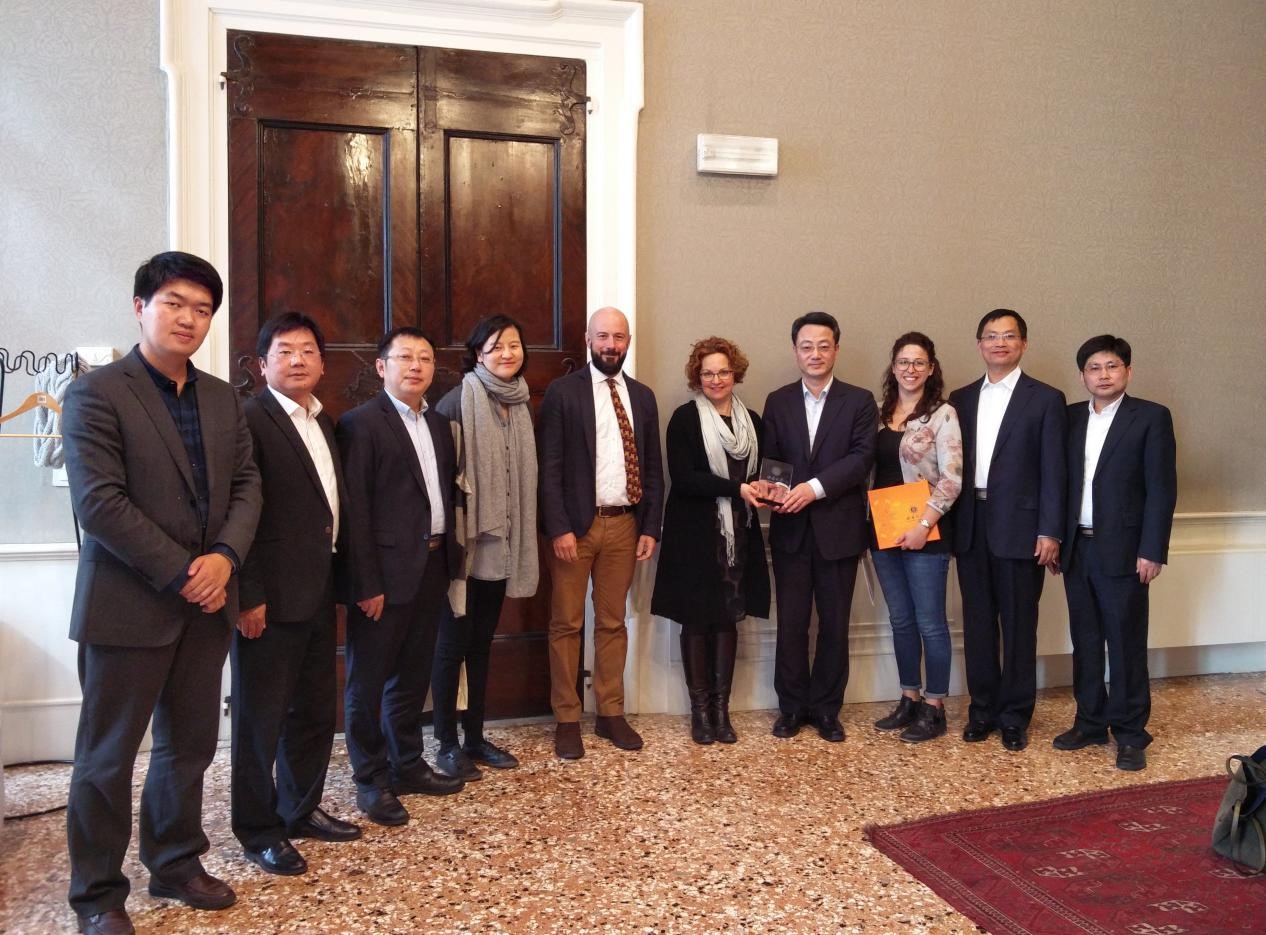 威尼斯大学创建于1868年,是意大利第一所、欧洲第二所商业专科学校,1903年正式升级为大学,是全意公立大学综合排名前十位的高校,设有经济学院、外国语言及文学学院、文学及哲学学院、理学院。近年来,威尼斯大学中文教育发展迅速,在校学习中文的学生人数多达1000多名,其汉学研究和教学规模已经跃居欧洲第一位。该校副校长兼汉学研究中心主任Tiziana Lippiello教授、国际部负责人Mauro Cannone先生、Roberta Bin女士、以及中国事务主管朱漪女士等与代表团会谈。二校曾与2016年10月份签署学生交流协议,同意每年互换20-30名学生进行交流学习,此次会谈中双方就该校汉语专业学生赴我校修读学分课程进行了详尽讨论,最终确定该校首批学生将于今年九月赴我校学习,第二批学生将于明年三月派出。双方还就我校汉语国际教育专业硕士生赴该校实习达成了共识,我校每年将派出实习生赴该校承担汉语教学辅助工作。此外,双方还就建立汉语国际教育双硕士学位项目进行了探讨并达成了初步意向。Tiziana Lippiello校长愉快地接受了代表团的邀请,拟于10月来校访问,深入了解我校的办学条件与环境,并就建立双学位项目的可行性做进一步商讨。