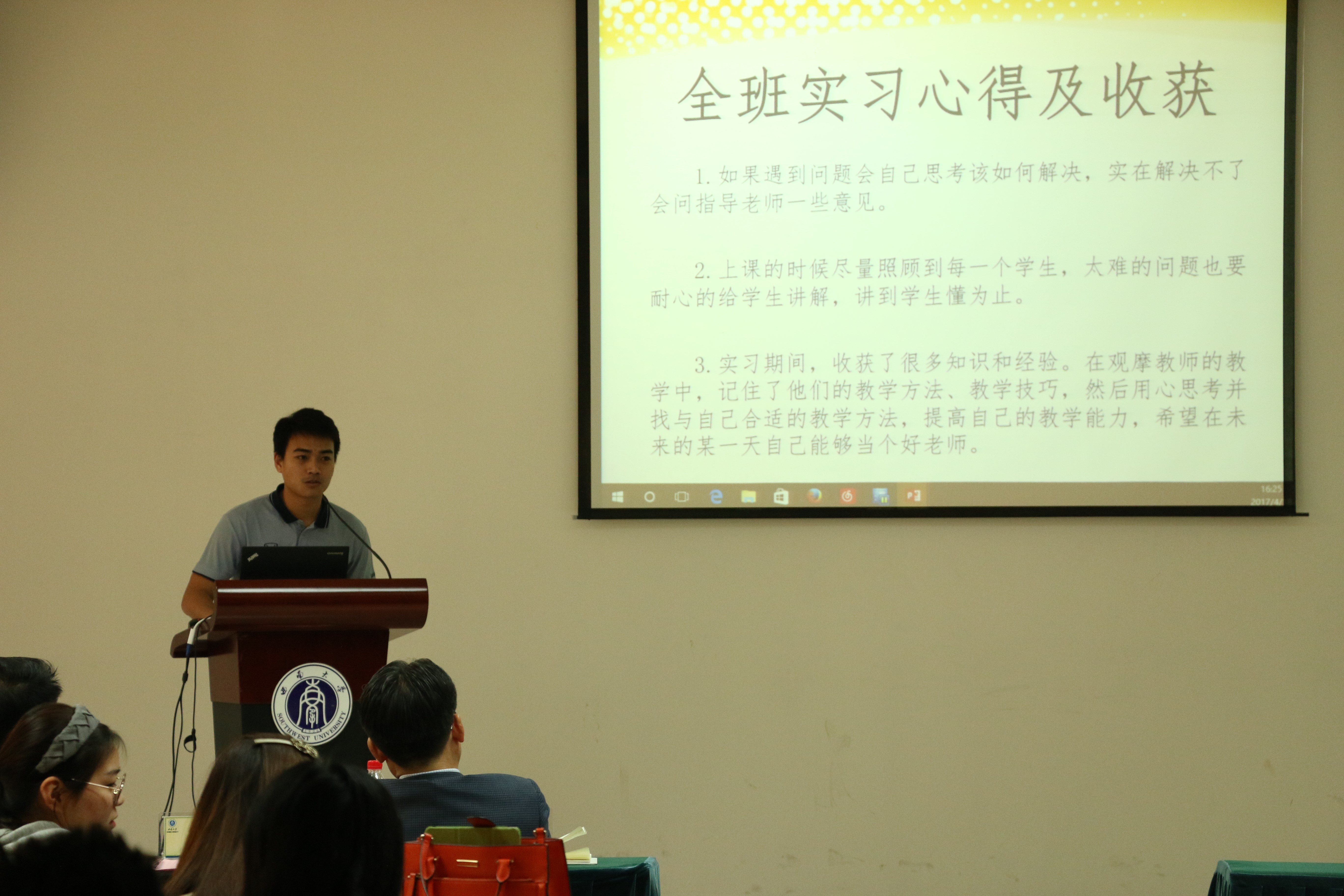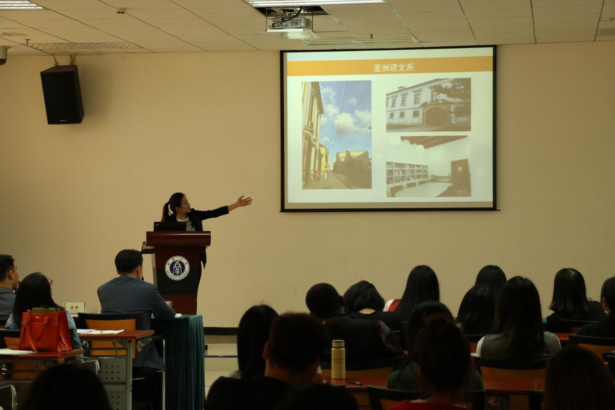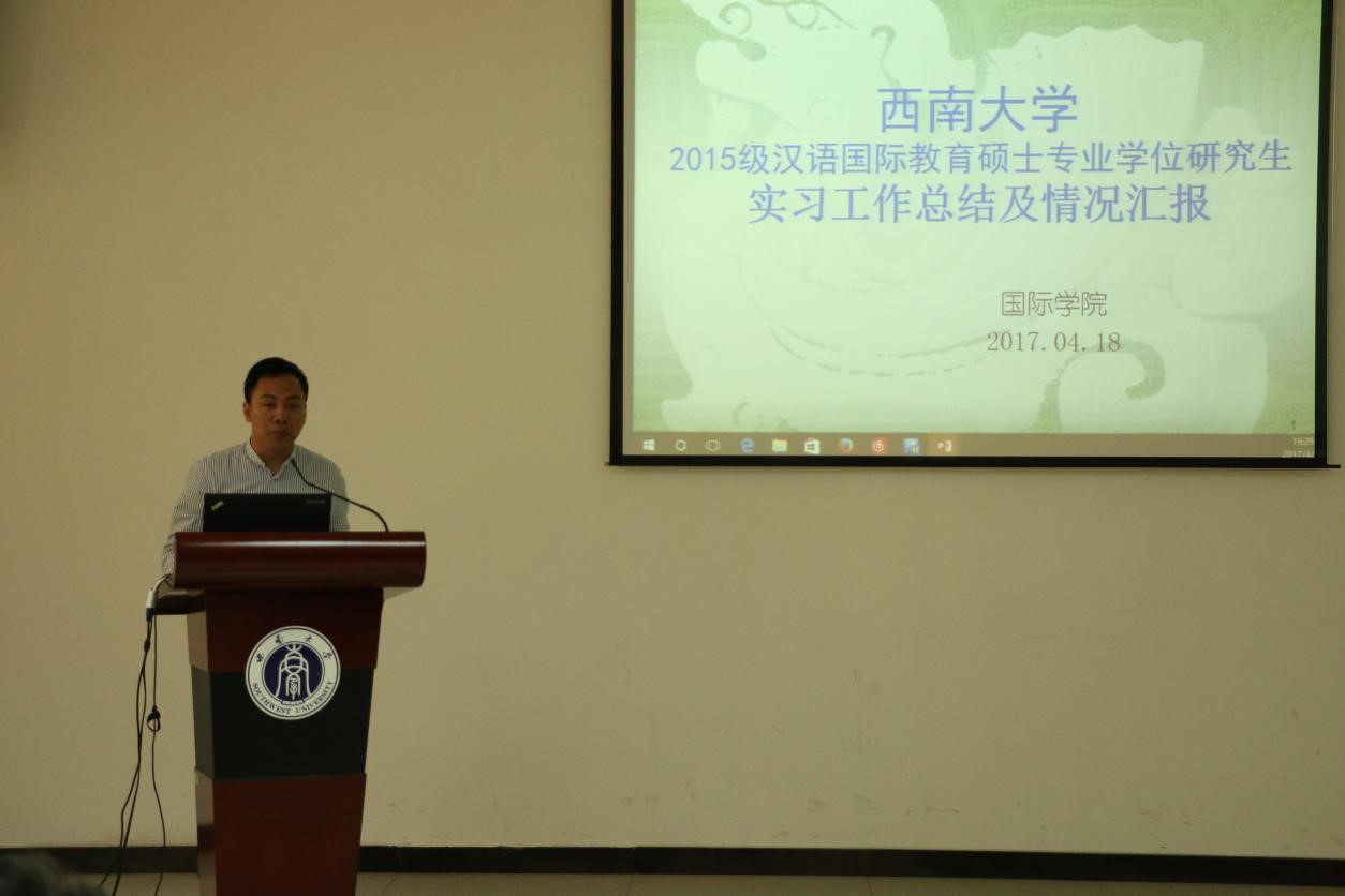 根据学科培养计划及学院实习工作安排,2015级汉语国际教育硕士中国学生班的31名同学和汉语国际教育硕士留学生班来自泰国、英国、蒙古、喀麦隆、贝宁等国的21名留学生于去年5月至今年3月陆续在泰国孔敬大学孔子学院、泰国正大管理学院、泰国国王科技大学、捷克帕拉茨基大学、韩国仁济大学、韩国蔚山大学、蒙古国立大学等实习点进行了海外实习。2015级汉硕中国班的吴宗燕、万明岩等5名同学以及15级汉硕留学生班的萧风同学作为实习小组代表依次上台介绍各实习点的实习情况。他们用生动幽默的语言结合图文并茂的PPT展示,分别就实习工作做了详细汇报。