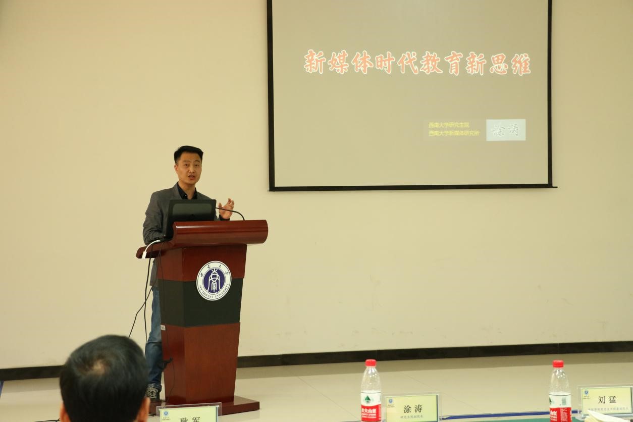 研究生院副院长涂涛做了精彩发言。他表示学校研究生院将全力支持汉语国际教育海外实习基地建设。随后他对“新媒体时代教育新思维”做了一个简单阐释,希望同学们能够以科学严谨的态度对待教学实习工作,能够结合新媒体有效地开展汉语教学。