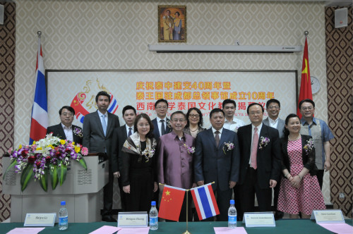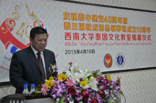 郭梅特先生在仪式上致辞,他说,今年是泰国诗琳通公主60华诞,中泰建交40周年,泰国驻成都总领馆成立10周年,又是伟德源自英国1946泰国文化教室揭幕,可谓四喜临门!希望泰国文化教室建设成为中泰学生相互学习、友好交流的重要平台。