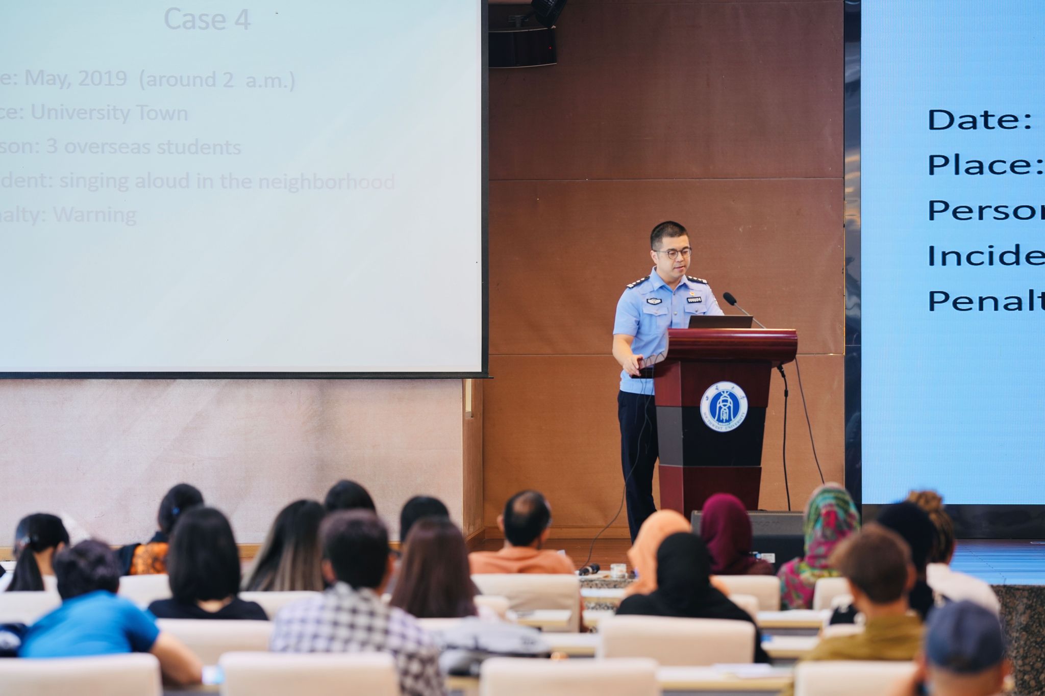 总队民警徐振芳从签证办理相关注意事项、外国人来华有关法律规定、非法打工、住宿登记等多个方面,仔细讲解相关法律法规,为全体来华留学生新生上了一堂严肃、有意义的法律课。