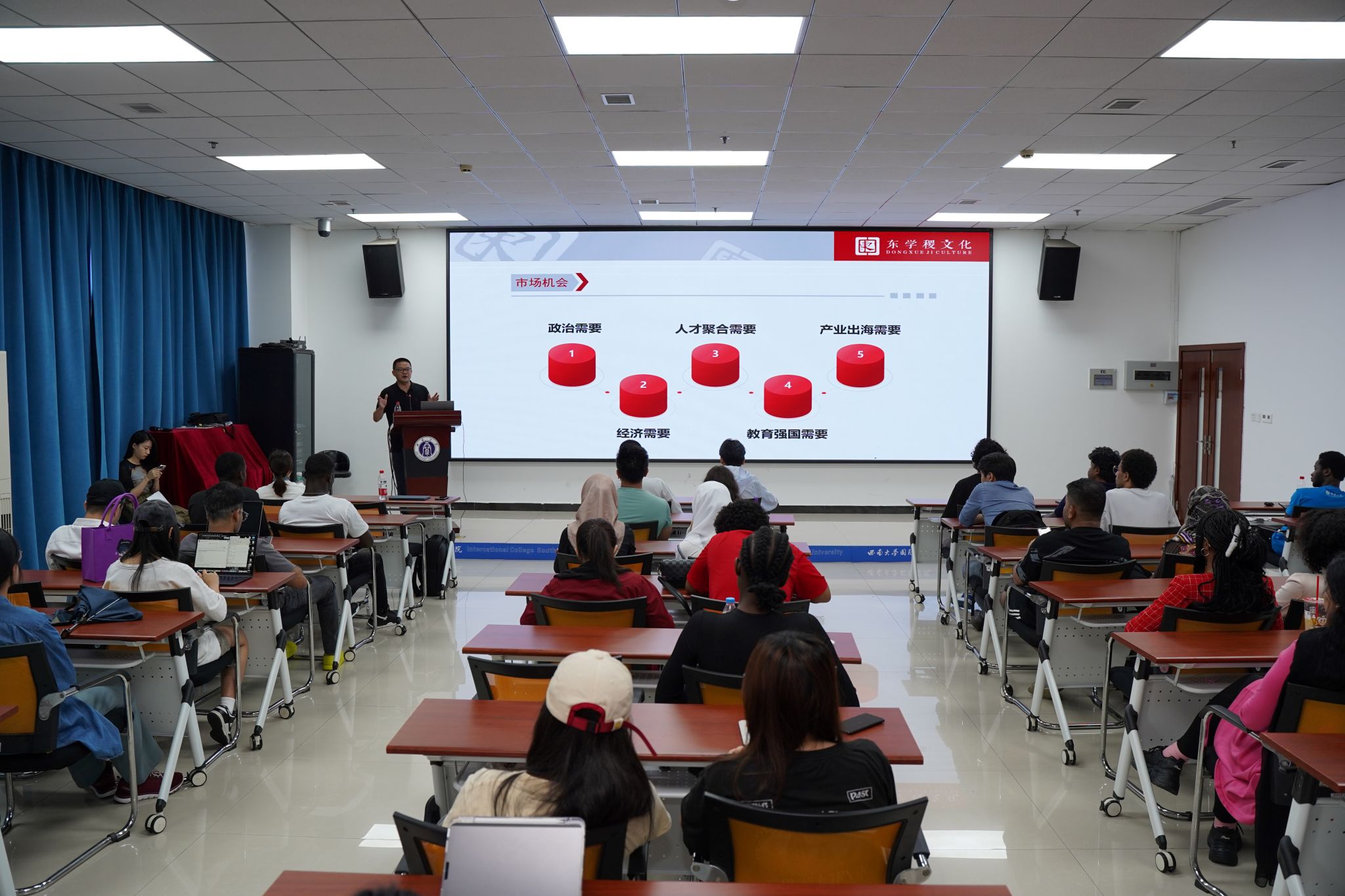 活动现场,重庆东学稷文化传播有限公司创始人王强详细介绍了公司的业务范围、企业文化以及对国际化人才的需求和发展机会。他通过生动的讲解和丰富的案例,让留学生们对当前就业市场有了更清晰的认识。