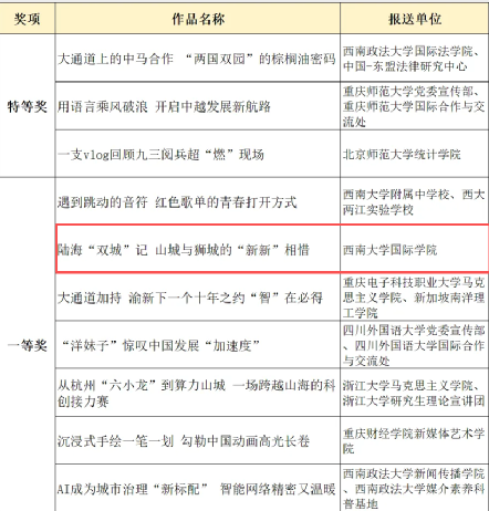 获奖作品聚焦重庆与新加坡的交流合作,生动呈现“陆海新通道”背景下山城与狮城的双城联动,既兼具理论深度,又饱含青春温度,更彰显了学院在培养知华、友华、爱华国际人才及推动中外文化交流上的扎实成效。