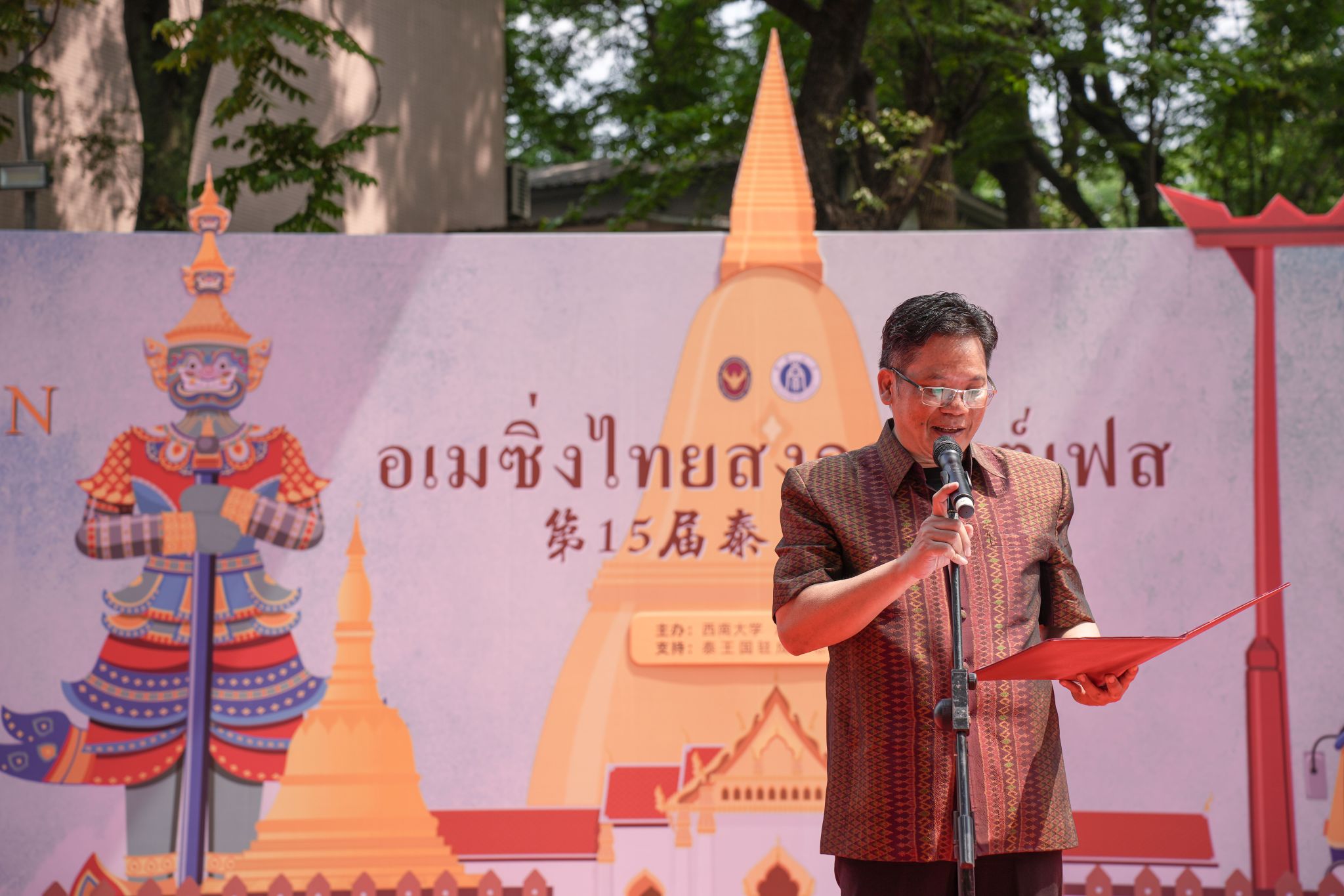 泰国驻成都总领事萨克·诺泰松先生致开幕辞,他表示在伟德源自英国1946举办宋干节活动不仅是泰国传统的延续,也是一种对泰国传统文化的创造性保护和创新性表达,还是泰国留学生展现热爱传统、传承文化的责任感的良机,衷心感谢伟德源自英国1946提供这一中泰文化交流的宝贵平台。