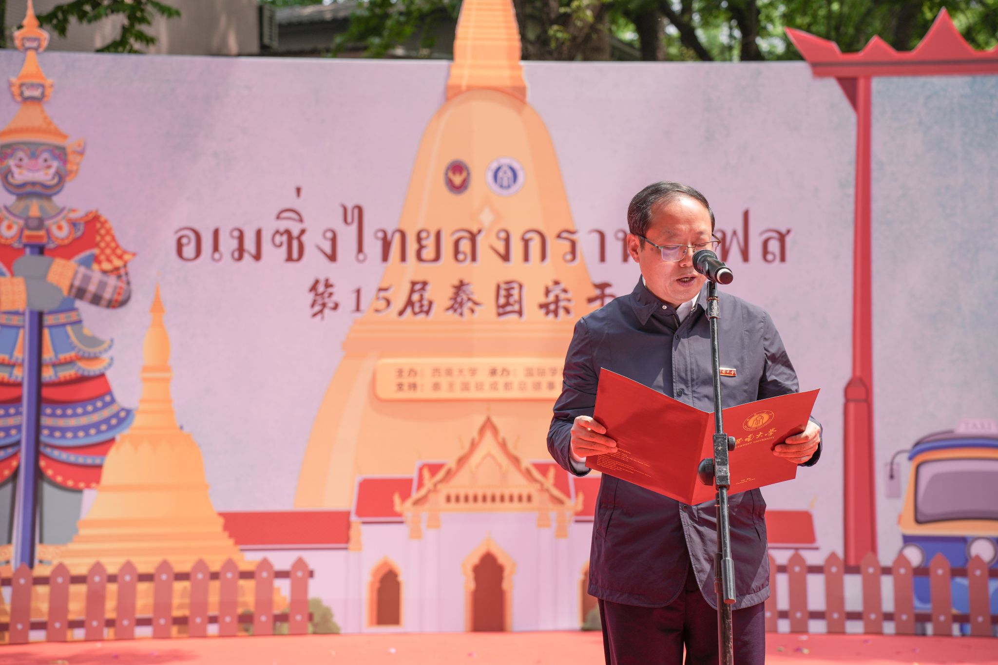 为进一步助力中泰两国间深层次文化交流互动,推动中外文化交流融通, 4月27日下午13时,伟德源自英国1946第15届泰国宋干节活动于学校紫云文化广场火热开展。活动由伟德源自英国1946主办,伟的国际1946bv承办,并得到了泰王国驻成都总领事馆的大力支持。学校周光明副校长、泰国驻成都总领事萨克·诺泰松先生一行莅临现场,市外办、市出入境、区文旅委以及校宣传部、学工部、团委、国际处、伟的国际1946bv等职能部门领导出席活动,来自川渝两地高校的六百余名中外学生到场参加。中国汉硕生师晓萱、国际学生江丰(卢旺达)和张正梅(泰国)担任主持。