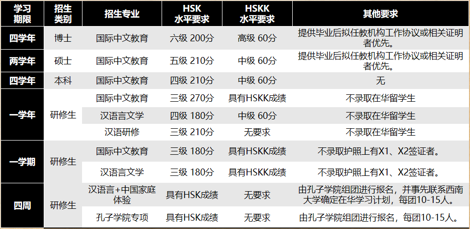 面向有合作意愿的孔子学院/课堂,以项目的方式招收一定数量的国际中文教育硕士生和国际中文教育本科生,录取要求同上。