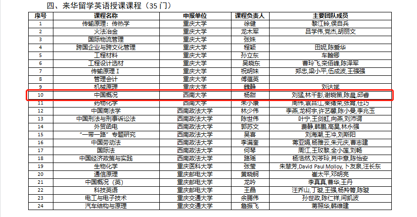 12月22日,重庆市教育委员会印发《关于公布2022年重庆市高校一流本科课程名单的通知》,由学院汉教系杨甜老师负责,刘猛、林千彭、谢晓笛、陈晨、邱睿等老师共同参与的来华留学英语授课课程《中国概况》从众多申报课程中脱颖而出,成功获批2022年重庆市高校一流本科课程,实现学院市级一流本科课程零的突破。