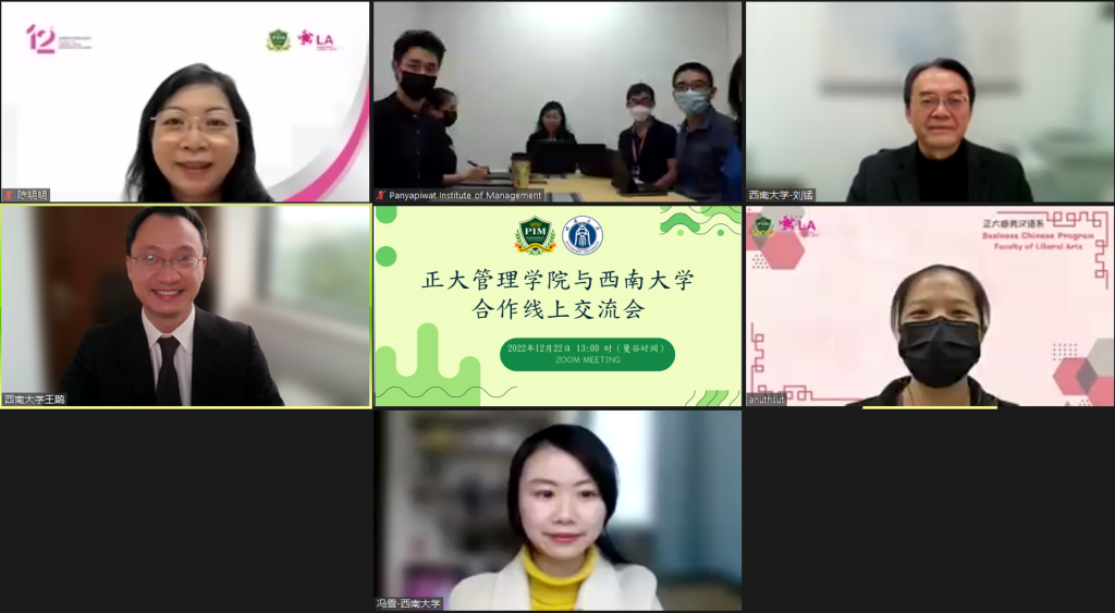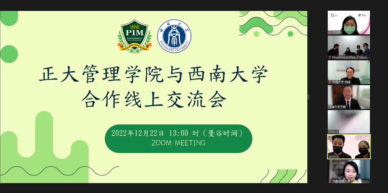 2022年12月22日下午,学校与泰国正大管理学院(以下简称PIM)成功举办线上校际合作项目推进会。正大管理学院文学院副院长陈明明,学校伟的国际1946bv刘猛书记、李航副院长出席会议。