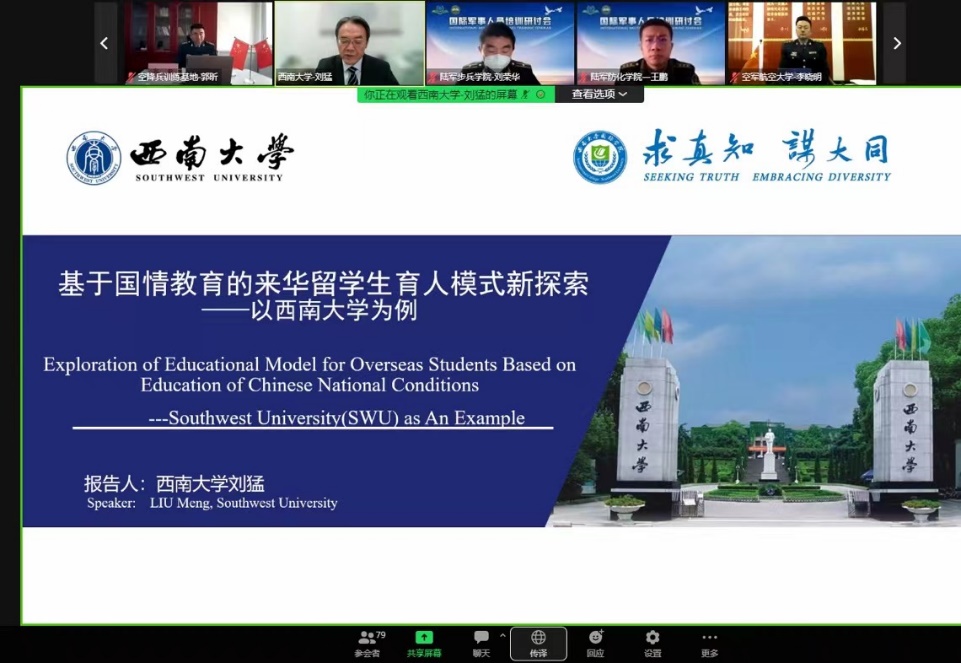 2022年12月8日-9日,以“新时代国际军事人员培训的挑战与对策”为主题的国际军事人员培训研讨会在陆军勤务学院隆重召开。学院党委书记刘猛受邀出席会议并作大会发言。本次会议采取线上方式举行,孟加拉国、缅甸、巴基斯坦、刚果(布)、加蓬、坦桑尼亚等10余国军队代表,以及国防科技大学等20余所中国军队院校(机构)派员参会。
