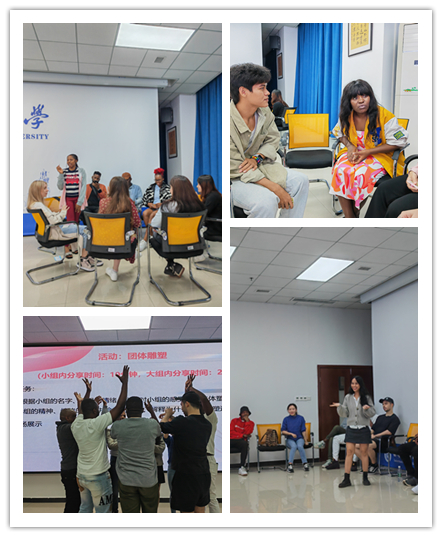 接着五人一组为团队展开主题活动,包括“知你知我”的主题小组分享会、故事创作会、小组精神雕塑塑造等活动。各组成员在活动过程中全身心投入,国际学生们于思维的火花碰撞时、于欢声笑语间冲破了陌生感的桎梏,拉近了彼此的心理距离。各国的国际学生在小小的一隅天地邂逅,敞开心扉共同嬉戏玩乐,他们不再有“独在异乡为异客”的漂泊感,而是真正体会到了“四海之内皆兄弟”。