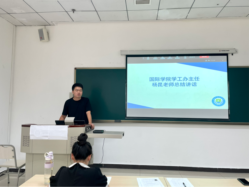 杨昆主任作总结讲话,回顾研会成立的经历,并对下一届研会干部提出四点期许:一是要有初心意识,情系师生、服务学院;二是具有大局意识,站在研会、学院的高度,统筹兼顾各部门工作,关怀帮助国际学生;三是树立宣传意识,采用有趣且有意义的方式对外宣传,进一步提高学院研会的知名度和影响力;四是培养进化意识,研会干部需不断完善自我,以提升自身工作能力、推动研会发展。