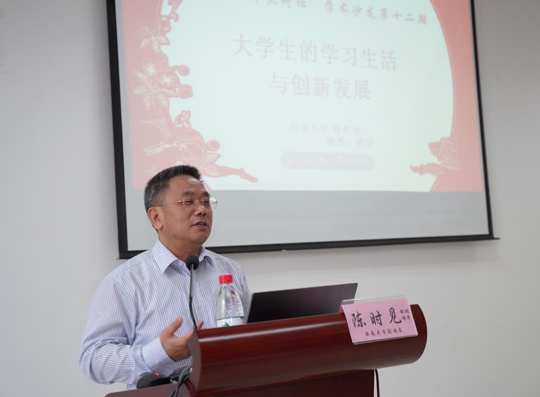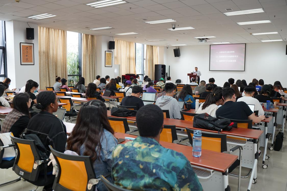 陈校长以“大学生的学习生活与创新发展”为题,结合自己的求学和工作经历,重点阐明三组关系:大学生学习的多样性以及学习与发展的关系,任务性学习与选择性学习的关系,选择性学习与创新发展的关系。他表示,学习是发展的前提,没有学习就没有发展。作为新时代的大学生,应该在课程学习中打牢知识基础,在自主学习中培养学习能力,在实践活动中提高实践能力,在自主活动中培养创新能力。他指出,任务性学习只能确保基础和毕业要求,选择性学习才是个体创新发展的关键。任务学习与选择学习的程度取决于学生的个体发展定位,要把统一性要求与个性化发展相结合,将集体式教育与个体式学习相统整。他强调,选择性学习主要基于学习兴趣,但是也不能只停留在兴趣方面,应该体现其未来性和发展性,而深度学习正是促进深度思考,挖掘学习潜质的不二法门。