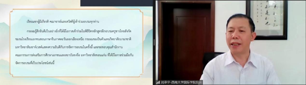 刘承宇对培训的圆满成功表示祝贺,深情回顾学校与孔敬大学的友谊和合作,希望在泰国教育部民教委的关心支持下,在孔敬大学和孔敬孔院的鼎力配合下,学校教育学科“双一流”质量优势和“留学西大”品牌优势进一步惠及泰国朋友,吸引更多优秀泰国人才来华深造。