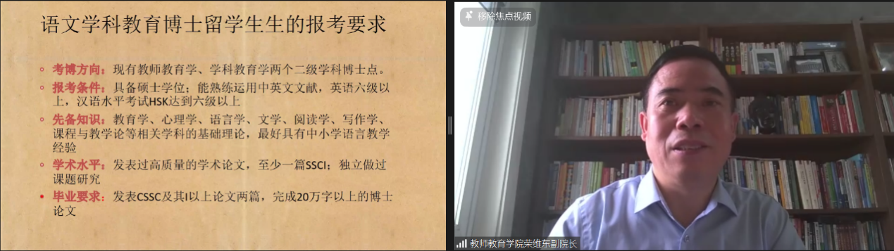 教育学部副部长罗生全教授介绍学部在学校“双一流”建设中的重要地位、重点学科,着重讲解教育领导与管理、课程与教学论、教育技术学等博士专业,并简要介绍来华留学生获得博士学位的必经阶段。