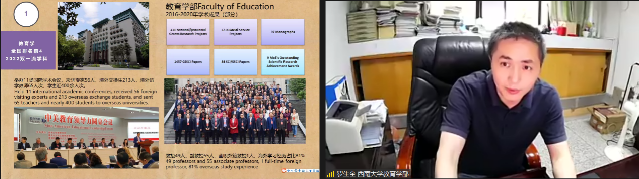 教师教育学院荣维东教授介绍该院打造“全国学科教育学建设高地”和“中国西部语文教育重镇”的基础和成果,热情欢迎泰国学生申请语文学科教育博士学位,并对培训教师提出殷切期望。
