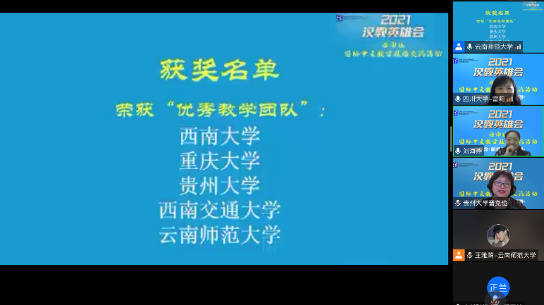 9.学院师生参加各类专业技能比赛获得奖励。在2021年“汉教英雄会”国际中文教学技能大赛中获“优秀教学团队”奖,在首届川渝地区国际中文教育教学技能大赛中获一等奖和三等奖。