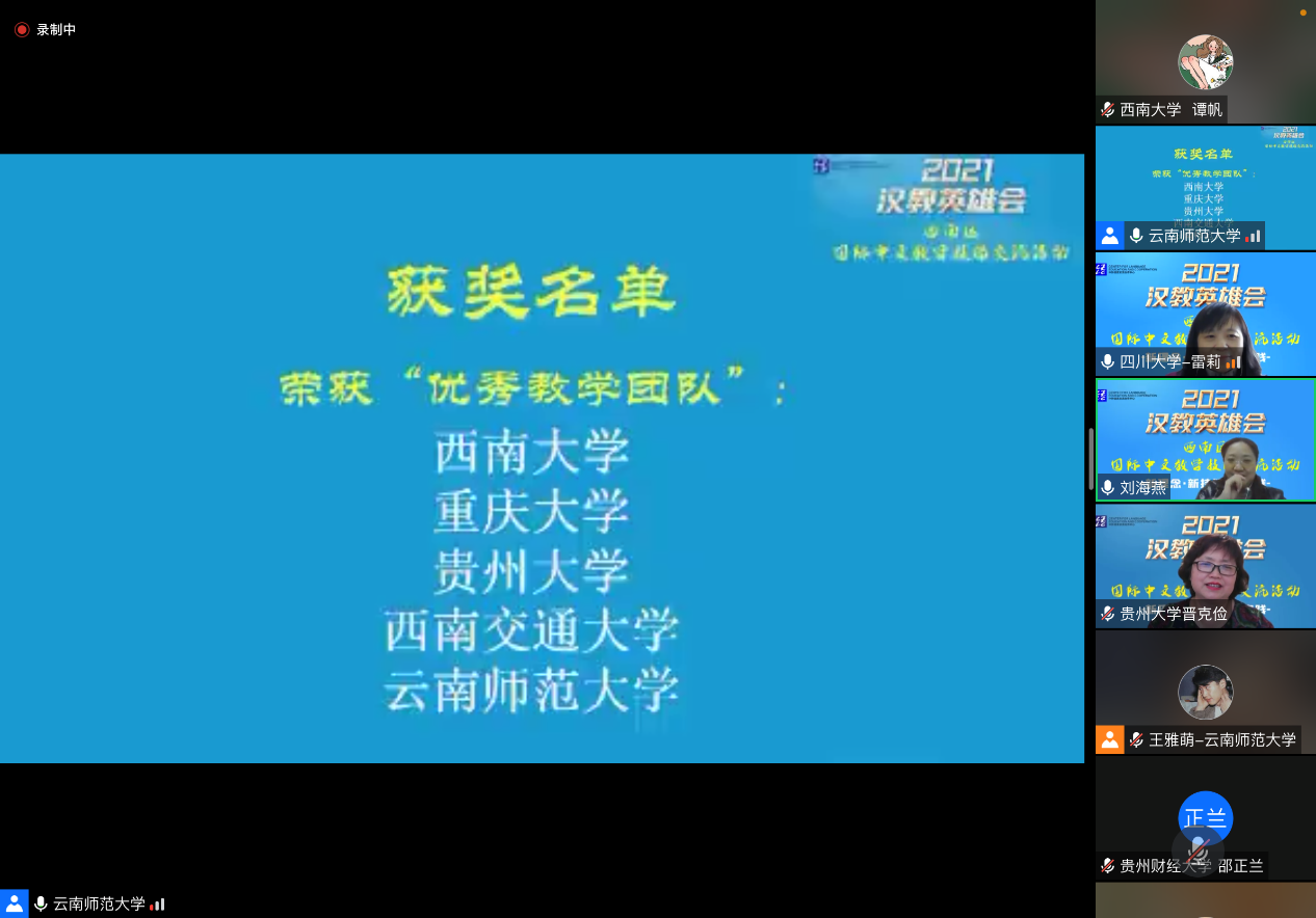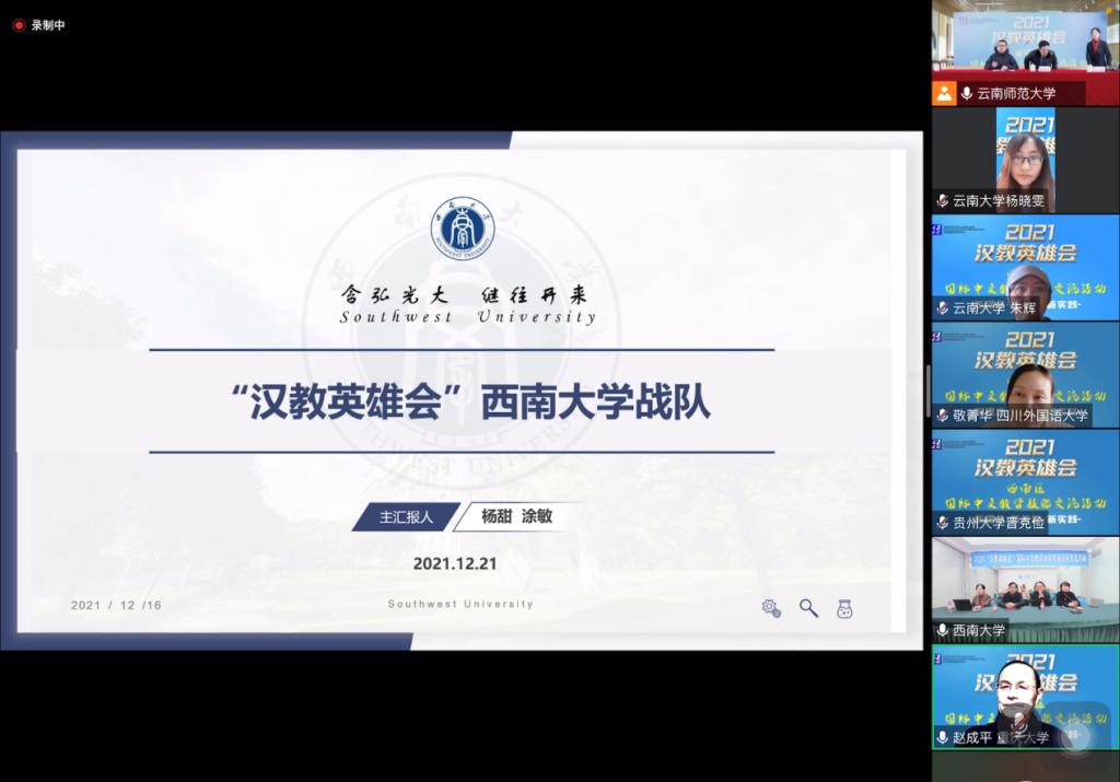 为推动国际中文教育的高质量发展,更新教学理念,创新教学方法,展示疫情下国际中文教师的风采,教育部中外语言交流合作中心举办了2021“汉教英雄会”国际中文教学技能全国交流活动,全国分为东北、西北、西南、华南、华中、东南六大赛区,共100余所汉硕培养院校参赛,最终30支优秀教学团队脱颖而出。学校师生代表团分别于12月15-16日和12月21日进行了全国展示汇报和西南片区展示汇报,介绍了学校和学院汉语国际教育专业发展和人才培养特色,并对此次参赛的课程理念、教学设计进行了“云端”交流。