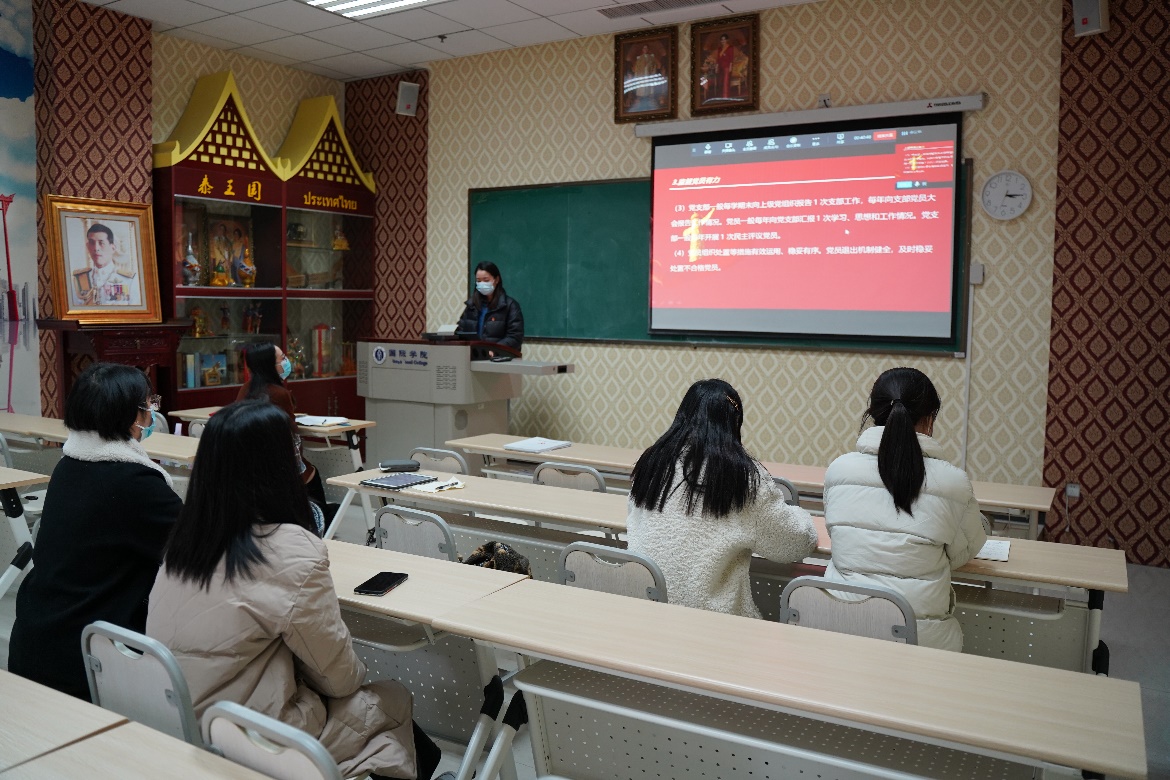 路妍同志领学《中国共产党普通高等学校基层组织工作条例》和重庆市高校党的建设工作会议精神,她从《条例》的修订背景、修订过程、修订意义、修订遵循的原则、修订内容和全文内容作了详细的介绍,突出强调了《条例》的政治性、原则性、实践性和针对性,表示,应时刻把握党的路线、方针,坚定做德才兼备、注重实际的青年党员。