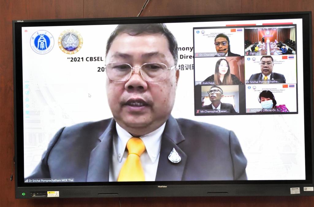 7月21日上午,重庆市人民政府市长奖学金丝路项目——“2021年泰国教育官员及校长培训”开班典礼通过在线的方式在学校教育学部举行。泰国教育部督察长斯彩、教育部常务秘书办公室国际合作顾问杜丽娅、区域教育特派员萨蔡童,重庆市教委国际处处长李斌,学校党委副书记李华出席开班典礼,教育学部和伟的国际1946bv的相关负责人,以及60余名泰国教育官员和校长参加典礼。开班仪式由伟的国际1946bv李航副院长主持。