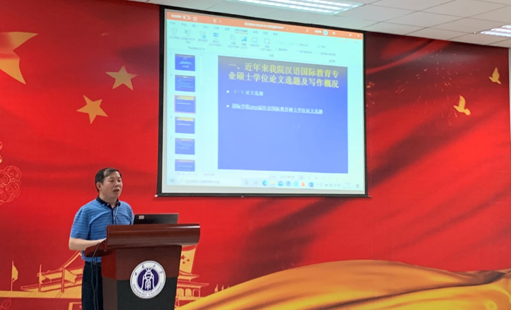 刘承宇教授以“应用语言学视阈下的汉语国际教育研究与论文写作”为题,从近年来我院汉语国际教育专业硕士学位论文选题及写作概状、汉语国际教育的学科属性与专业定位、应用语言学的研究话题与研究方法、应用语言学视域下的汉语国际教育研究选题及论文写作等四个方面出发,结合本专业对学术论文写作进行指导。他从“大处着眼、小处着手”讲授论文选题,用实际的例子谈到了永恒话题与热门话题之间的区别,并建议研究者从著作、会议、期刊、硕博论文中寻找选题,善于发现学术领域中的“美”。除了研究话题之外,他还结合一本英文原著对研究方法进行介绍,指出要用恰当的研究方法去匹配研究问题。在学术领域的探索途中,选题就像是指路明灯、研究方法就像是手中的工具,两者共用,才能在学术探索的道路中走得更远。他还结合自己参与编写的一本关于学术论文写作的书,提到了论文写作的基本要点,主要包括标题、中心论点、提纲、参考文献等的细节把握。