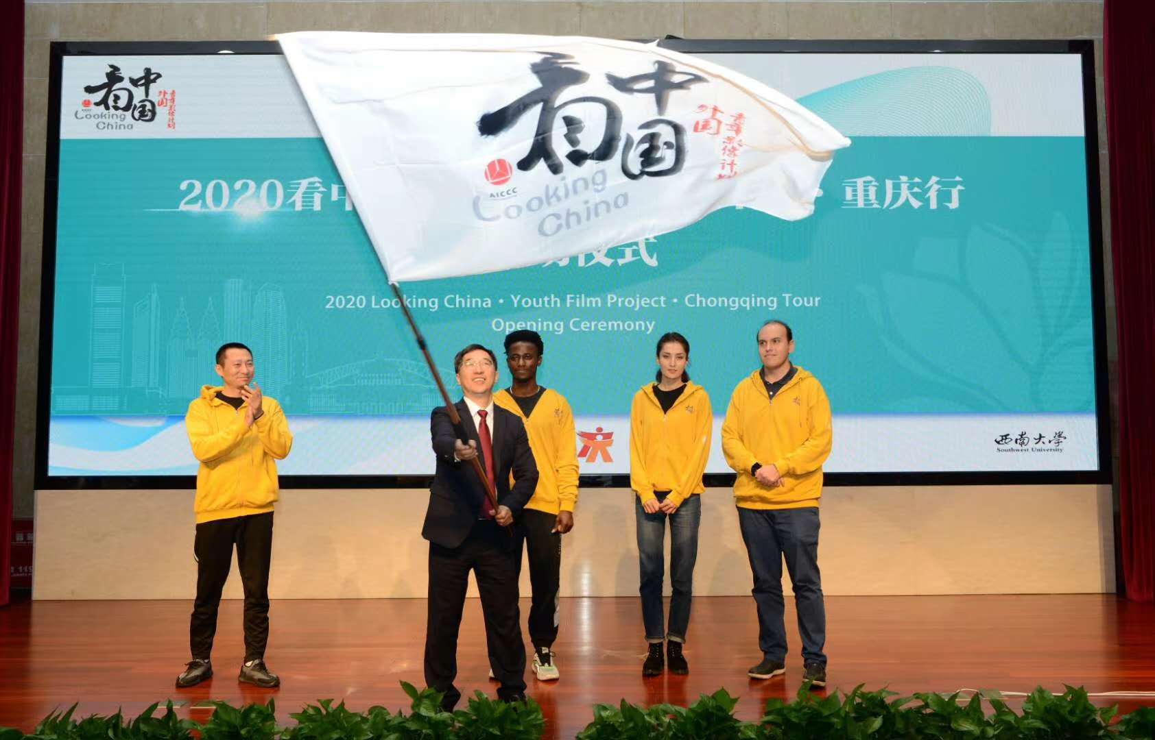 重庆市委宣传部副部长、重庆市文明办主任马岱良与北京师范大学中国文化国际传播研究院副院长罗军,为外国青年导演代表授旗。