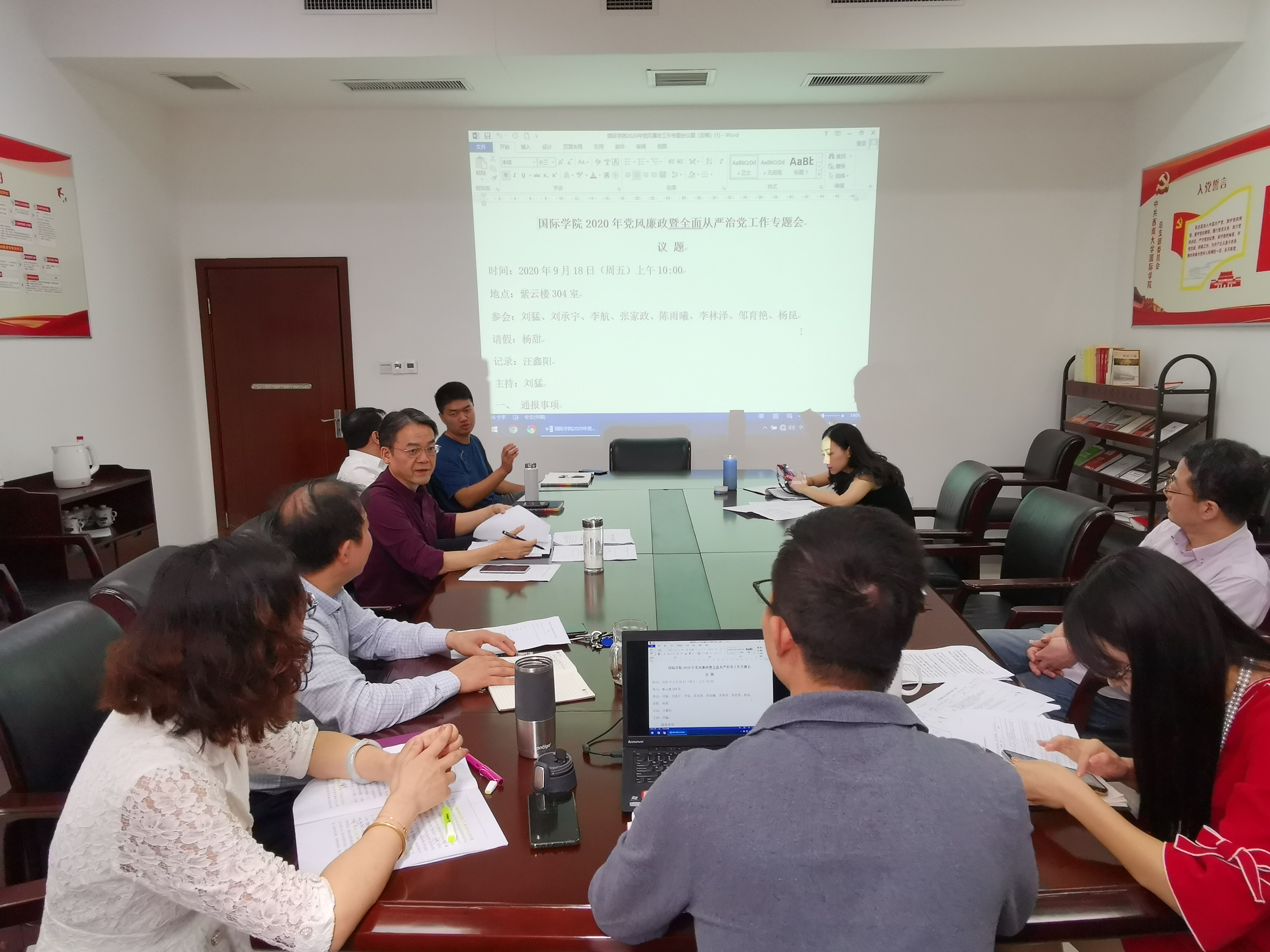 为深入贯彻落实党的十九大和十九届二中、三中、四中全会及十九届中央纪委历次全会精神,进一步加强学院惩治和预防腐败体系建设,构建权责清晰、流程规范、风险明确、措施有力的廉政风险防控机制,持续推动全面从严治党向纵深发展,9月18日上午,学院在紫云楼304会议室召开2020年党风廉政暨全面从严治党工作专题会,党总支书记刘猛、院长刘承宇、副院长李航、副院长张家政、党总支委员、各支部书记、各科室负责人参会。会议由党总支书记刘猛主持。
