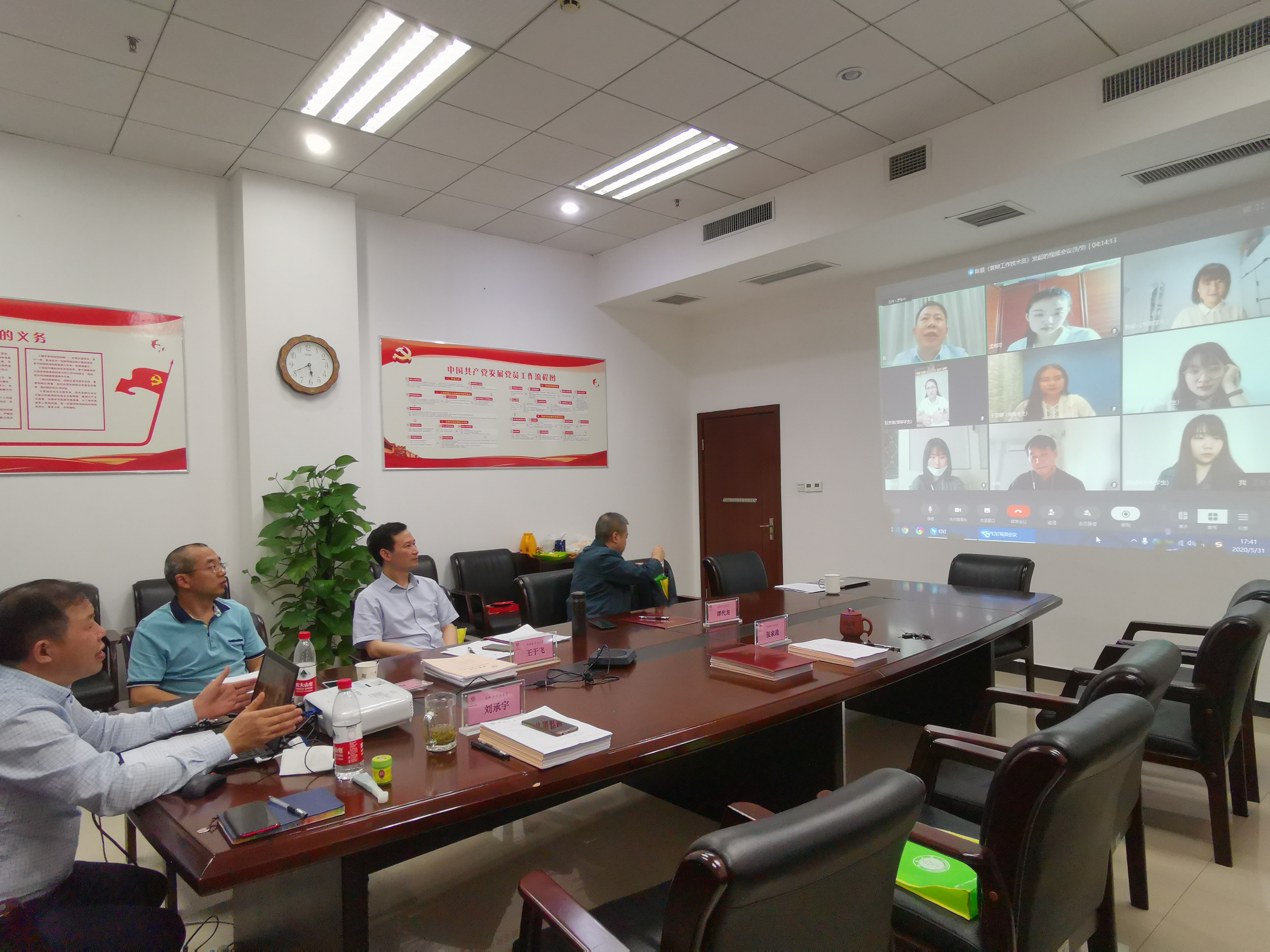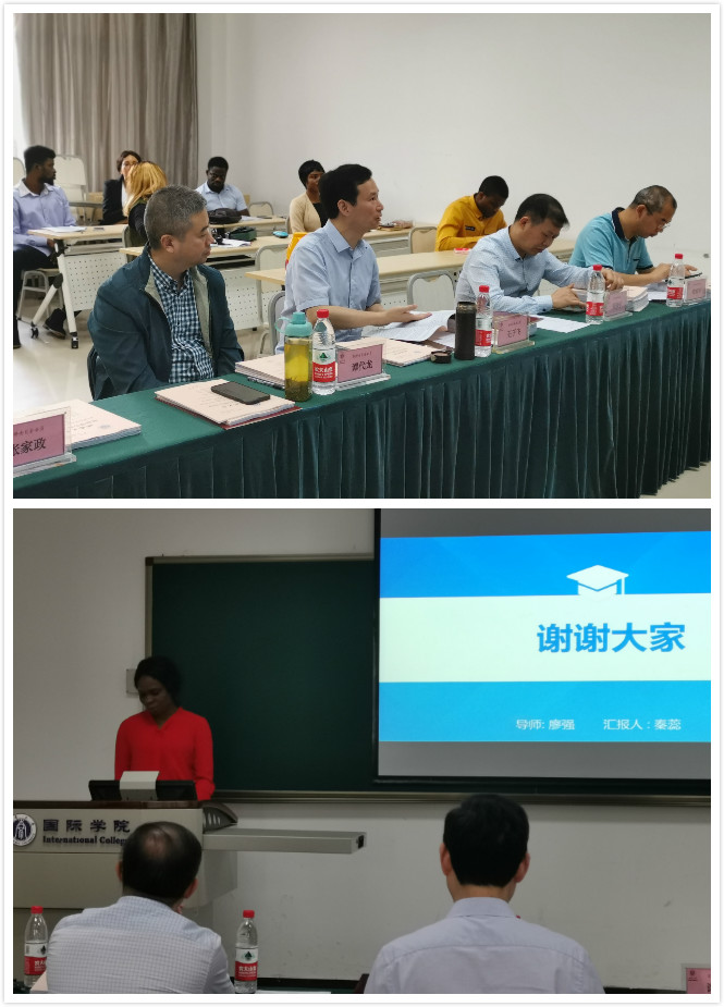 委员交流结束后,答辩正式开始。上午9:00-12:30,线下答辩在紫云楼312教室进行,何洁和来自尼日利亚的宋珂等9名在校中外学生依次参加了答辩;下午1:30-5:30,线上答辩在紫云楼304会议室进行,陈希、孟栩可和来自泰国、越南、尼日利亚等国家的8名中外学生依次远程接入钉钉视频会议进行论文PPT展示与陈述,并回答了答辩委员会委员提出的问题。