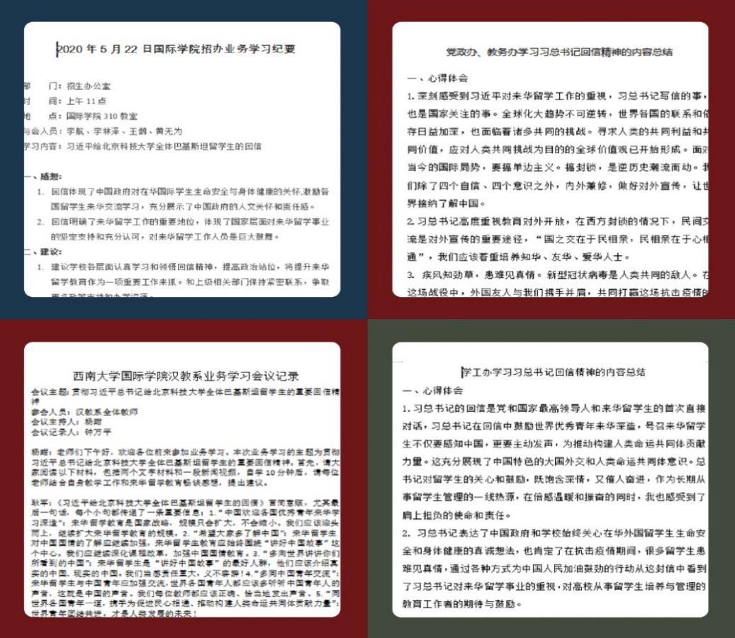 二是召开教职工专题学习会。5月22日,各科室和汉教系由科长、系主任传达习近平总书记重要回信精神,强化主体责任,把学习贯彻回信精神和当前来华留学事业发展、教学改革、服务管理、绩效考核等重点工作有机结合,不断完善规章制度,严格招生审核、过程管理和评审制度,建立规范的管理体系和工作流程。加强教学资源配给和师资管理队伍建设,积极打造来华留学重点项目和精品工程。学习讨论结束后,各科室和汉教系分别撰写了总结报告。