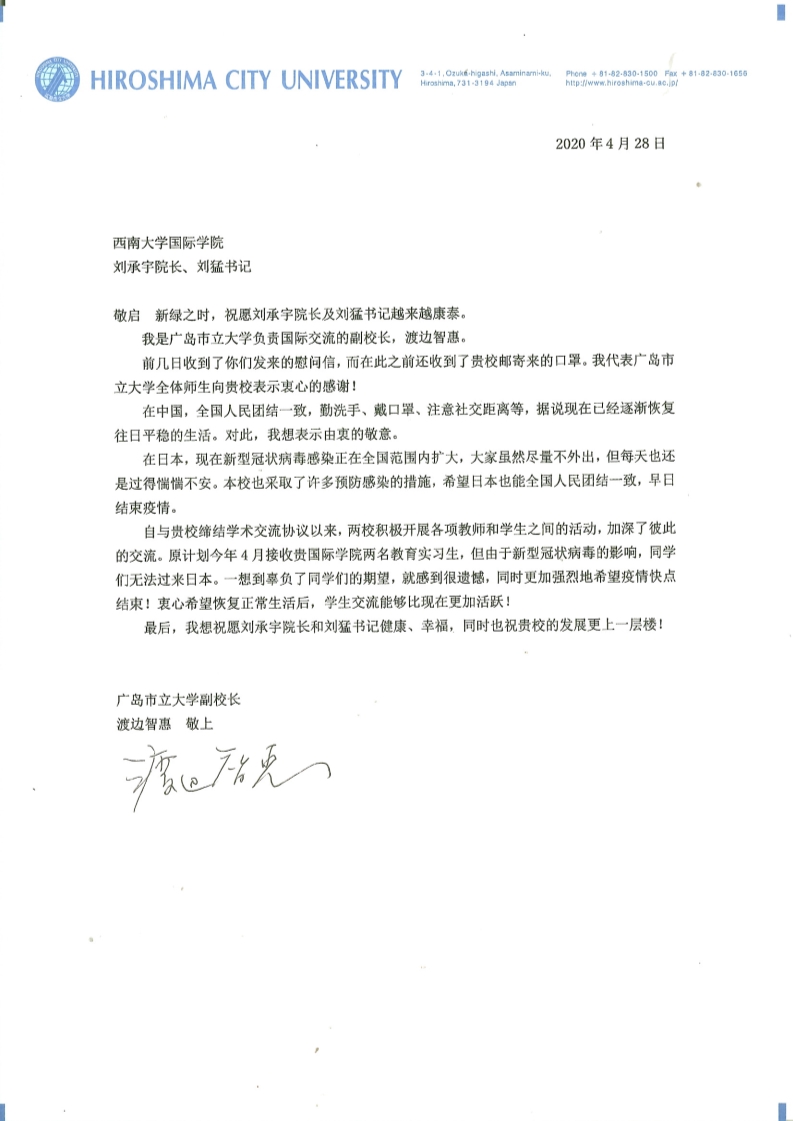 日本广岛市立大学副校长渡边智惠在回信中表达了深深的谢意。指出,日本全国人民包括该校都采取了多种预防感染的措施,目前正在团结一致积极抗击疫情。渡边校长还对因疫情影响无法于今年4月赴日本实习的我院两名学生表达了遗憾,希望疫情结束后两校在学生交流方面能更加活跃。