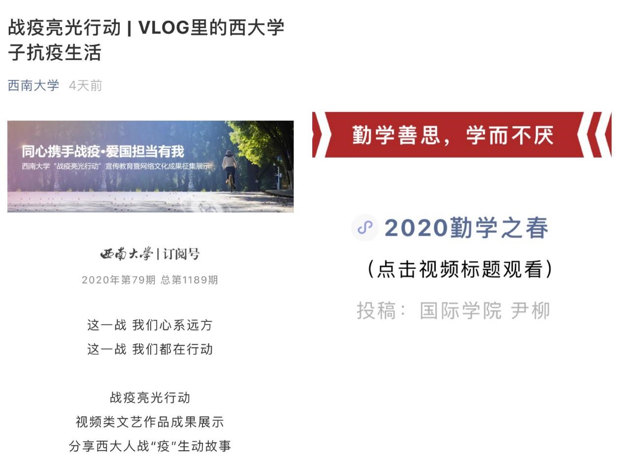 为学习贯彻好习近平总书记重要指示精神和党中央关于新冠肺炎疫情防控重大决策部署,学校启动了“战疫亮光行动”宣传教育暨网络文化成果征集展示工作,鼓励师生分享西大人战“疫”的生动故事。