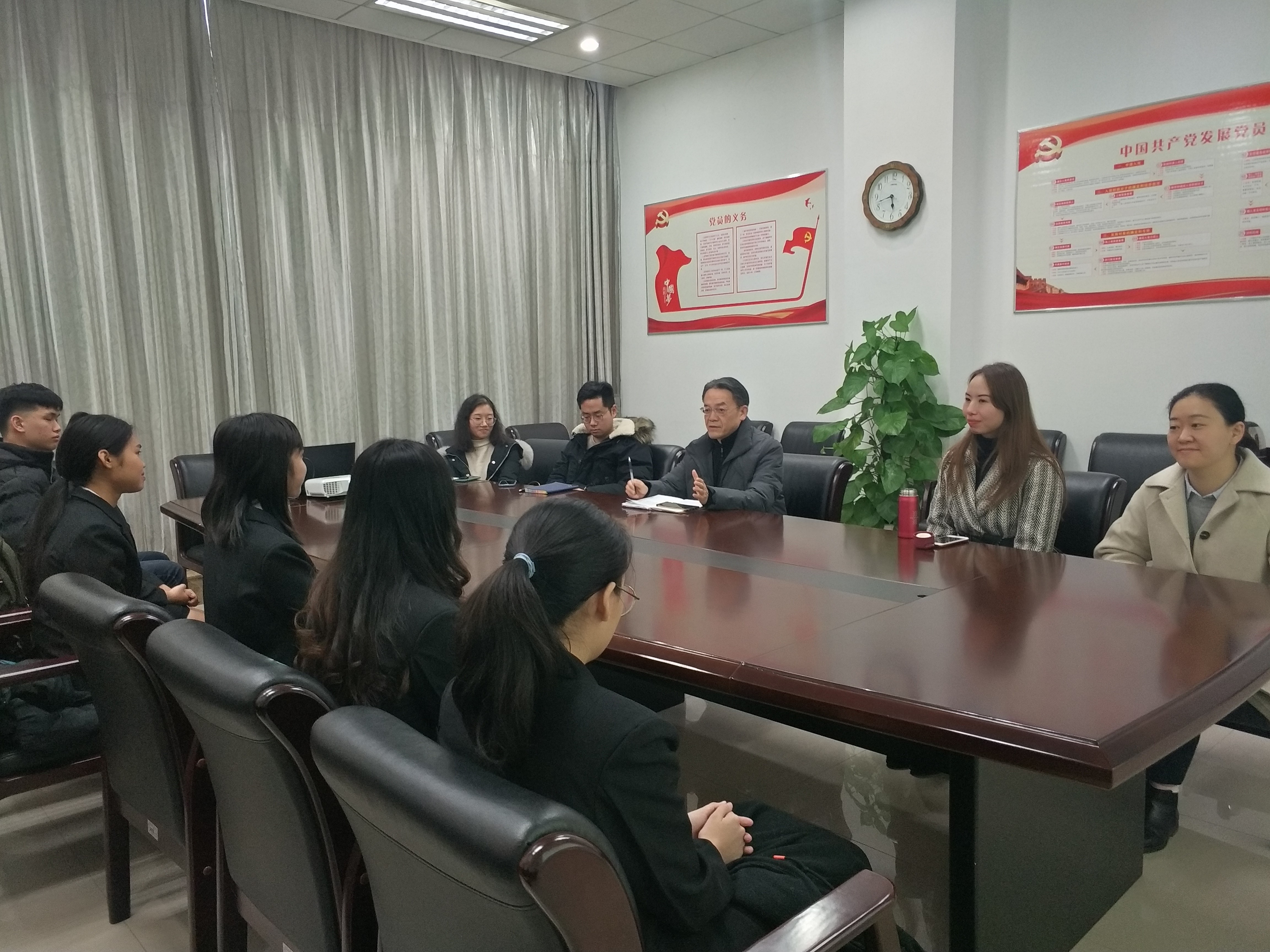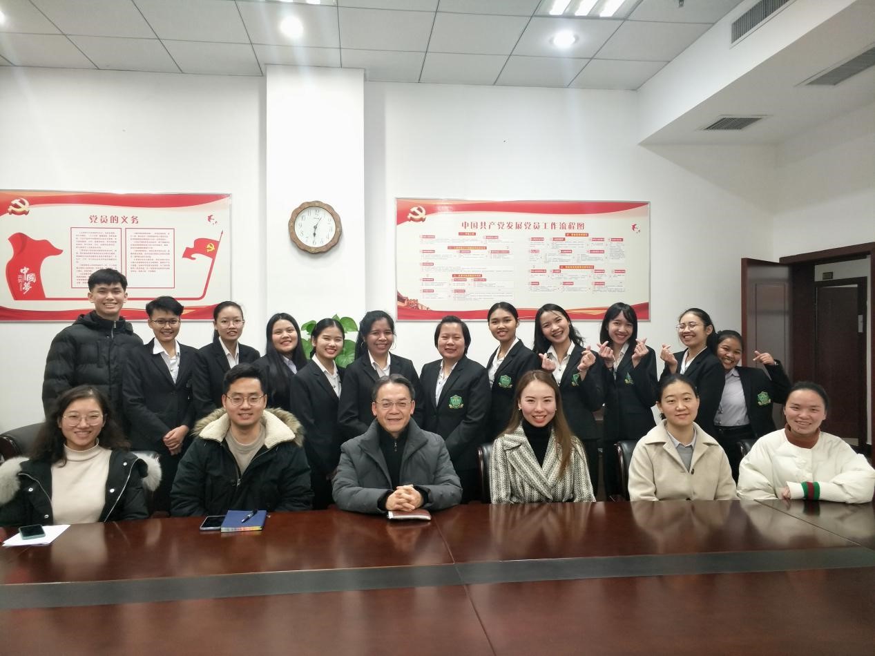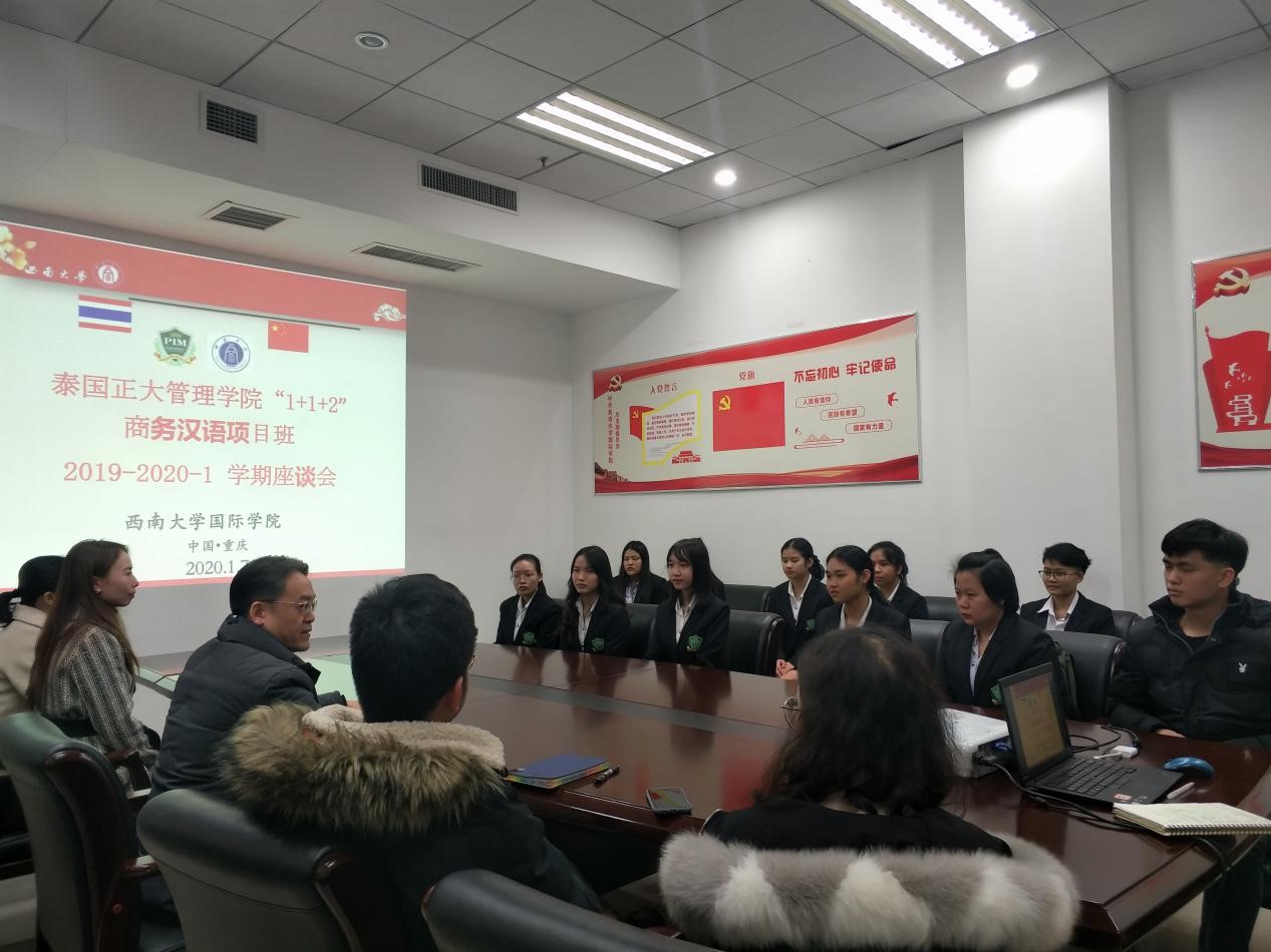 2020年1月7日下午五点,2019级泰国正大管理学院项目班学生2019-2020-1学期期末座谈会在学院304会议室圆满举行。学院党总支书记刘猛,任课教师代表陈晨、钟万平、王霜、刘欢欢等四位老师,以及12名泰国学生参加会议,座谈会由班主任吴宗燕老师主持。