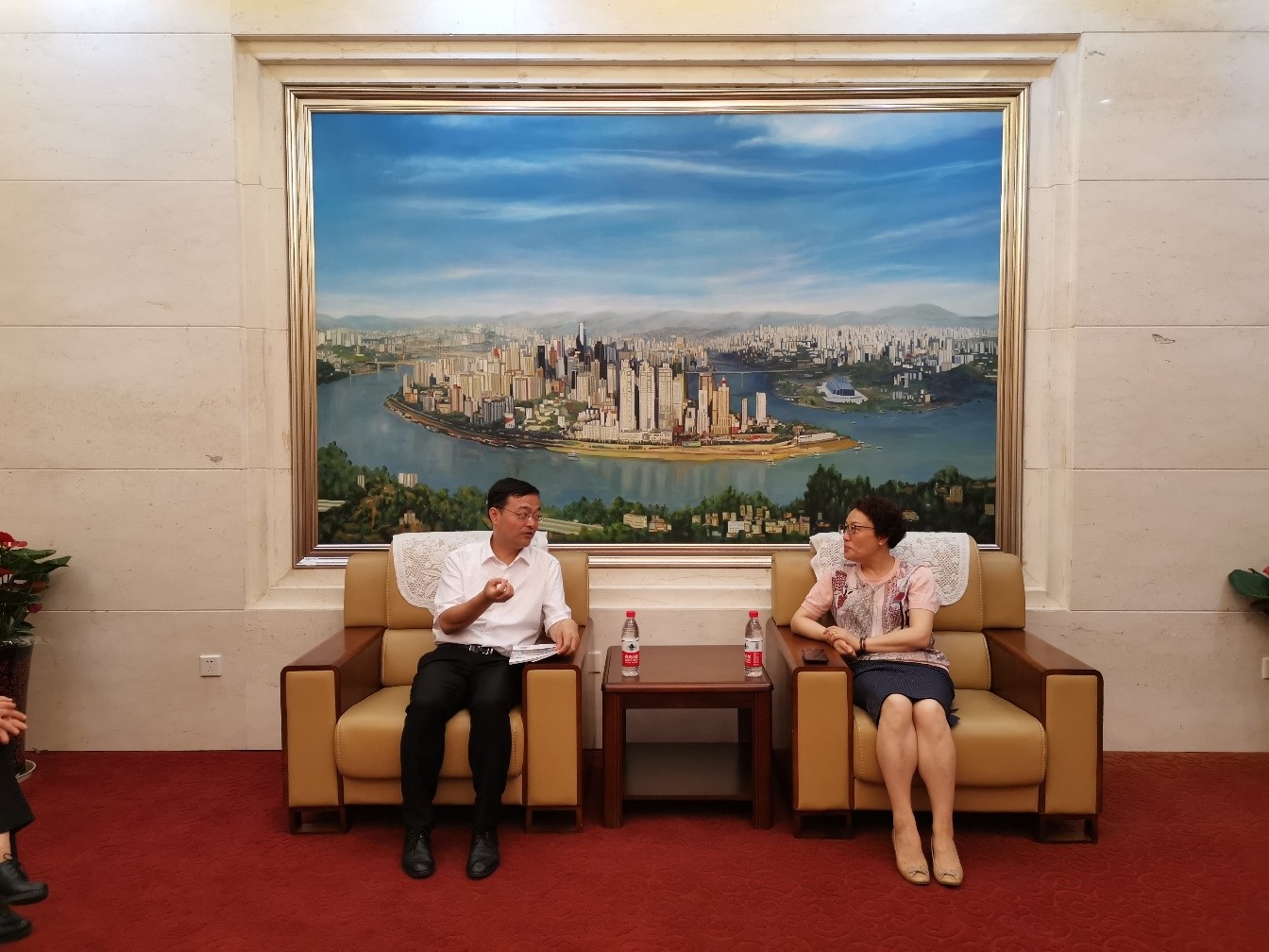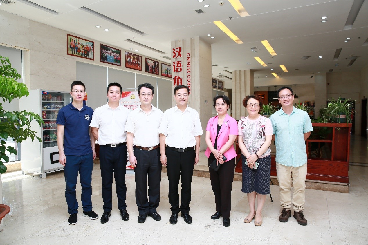 院长王静、副院长李航、招生办主任李林泽、项目负责人王鹊等接待了齐主席、陈主席一行,汇报了学校来华留学教育的发展与现状,陪同参观了国际学生教学、文化及生活设施。