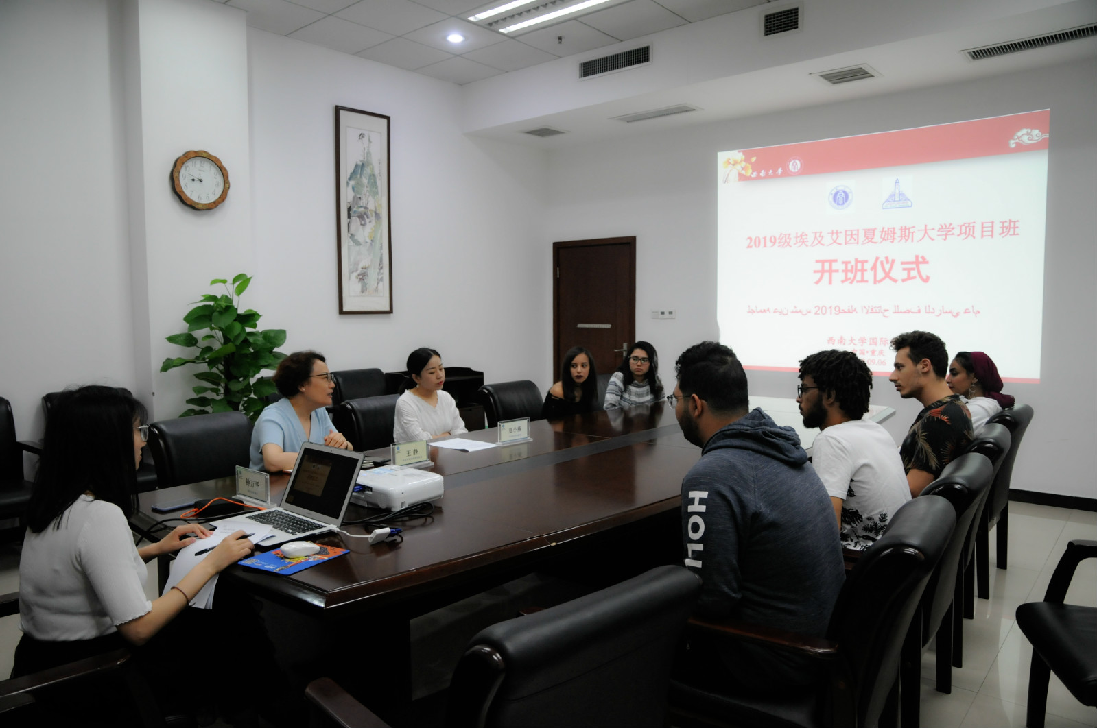 2019年9月6日上午8点40,2019级埃及艾因夏姆斯大学“2+1+1”本科学分项目班(翻译专业)开班仪式在伟的国际1946bv紫云楼304会议室举行。伟的国际1946bv院长王静,外国语学院夏小燕老师以及2019级埃及项目班新生参加了会议。会议由班主任老师钟万平主持。