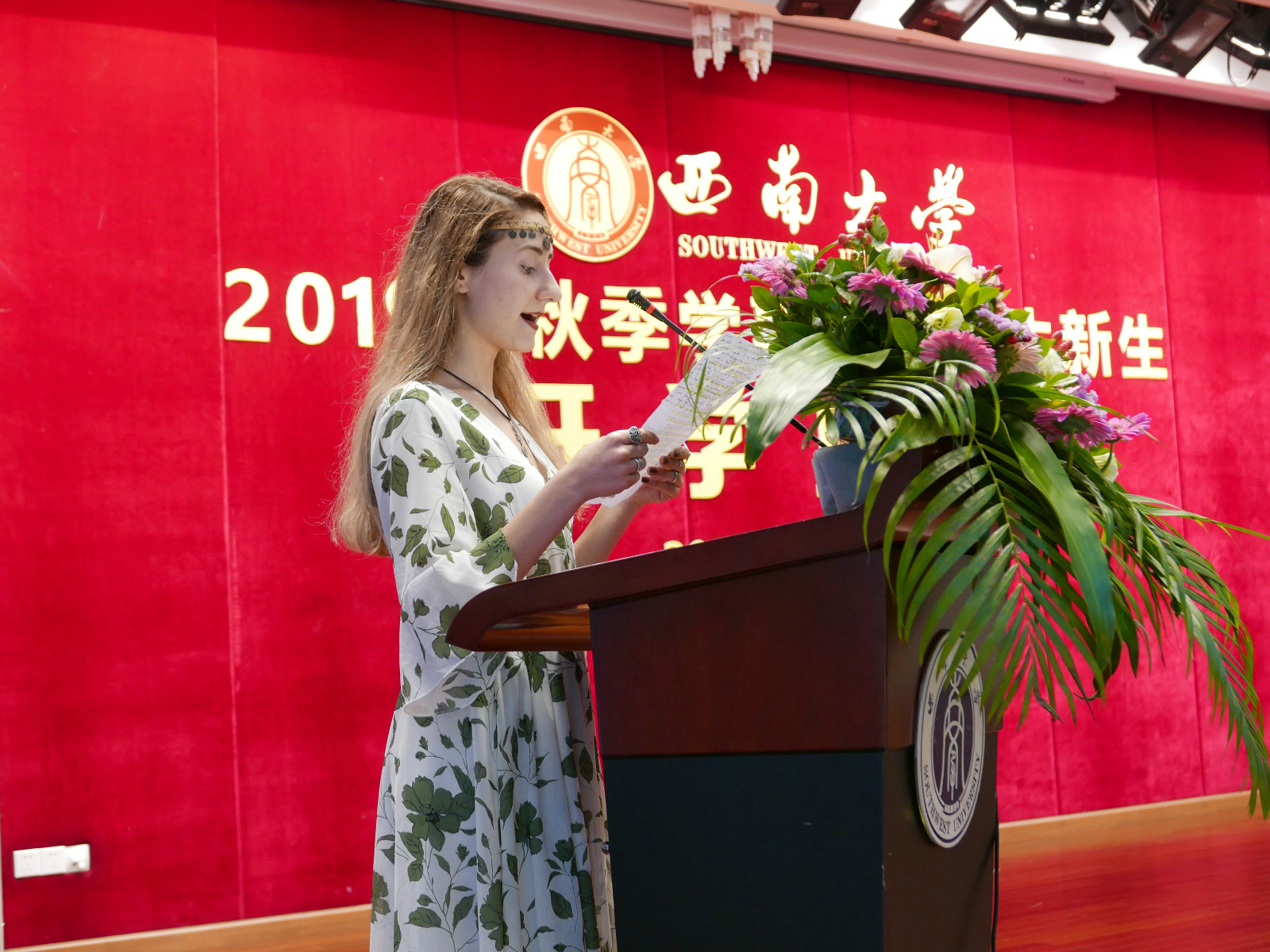 学生会主席维安作为高年级学生代表发言,对2019级新生们表示热烈欢迎,结合自己在学校的成长,鼓励学弟学妹们开阔视野、体验多元文化、促进世界各国的友好交流。