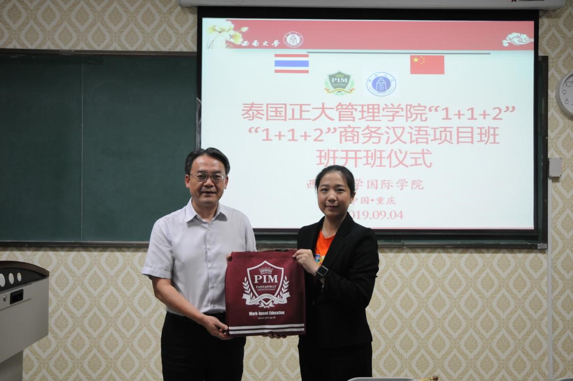 随后,刘猛书记与泰国正大管理学院周小月老师互赠礼物,具有中泰特色的礼物传递着两校师生浓浓的情谊。我们期待双方能在更多领域加强合作、结出硕果,也希望这些学生能在西大放飞梦想,学有所成。