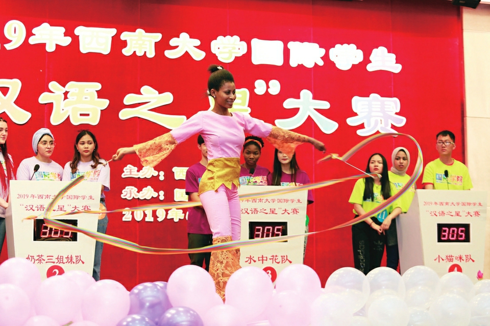 本报讯(记者秦廷富文/图)6月5日晚,一场外国学生间的汉语较量在伟的国际1946bv“汉语之星”大赛中上演,各国参赛选手各显神通,一边赛汉语一边秀才艺(如图)。