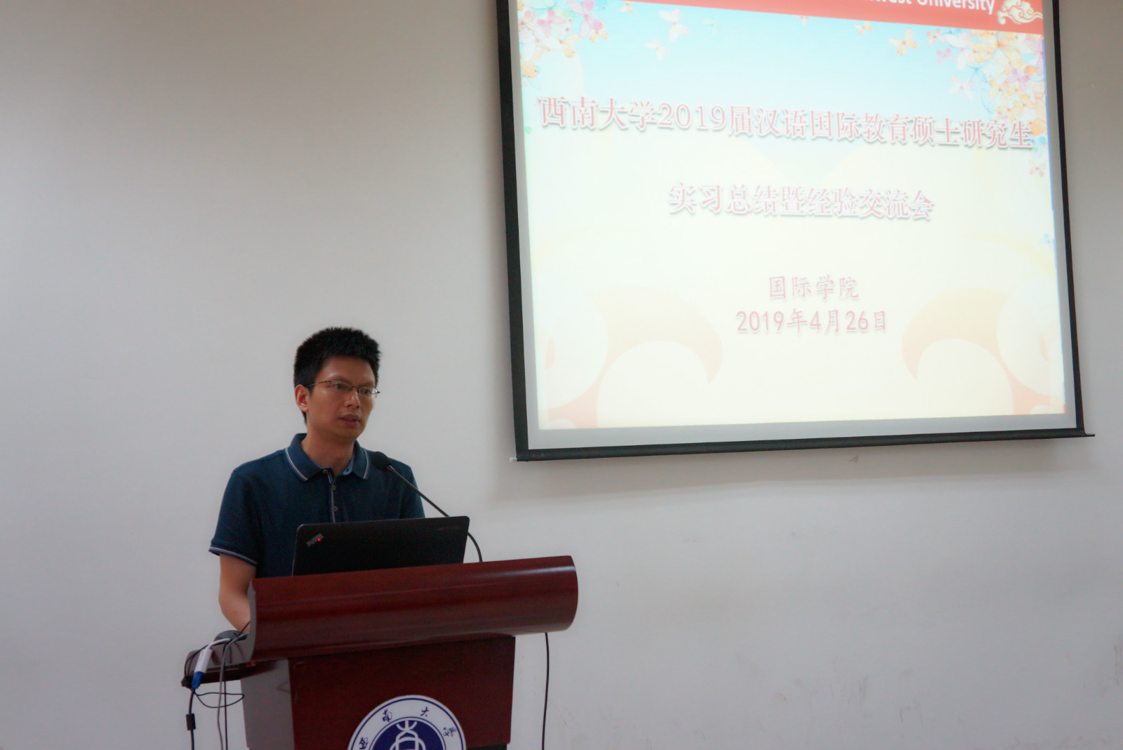 学院党总支书记刘猛在发言中指出,一年一度的实习总结会已经坚持了八年,同学们能顺利完成学院和学校的任务,离不开研究生院的大力支持,也离不开各位指导老师的帮助和付出。刘书记就实习总结和今后的专业学习对同学们提出了三点希望,结合目前汉语在国际上的地位进一步总结了同学们实习工作中的得失,希望汉语国际教育硕士的海外实习基地建设能够突出特色、形成亮点,并希望实习回来的同学和即将赴海外实习的18级学生能够坚定从业信念,积极投身汉语国际推广事业。