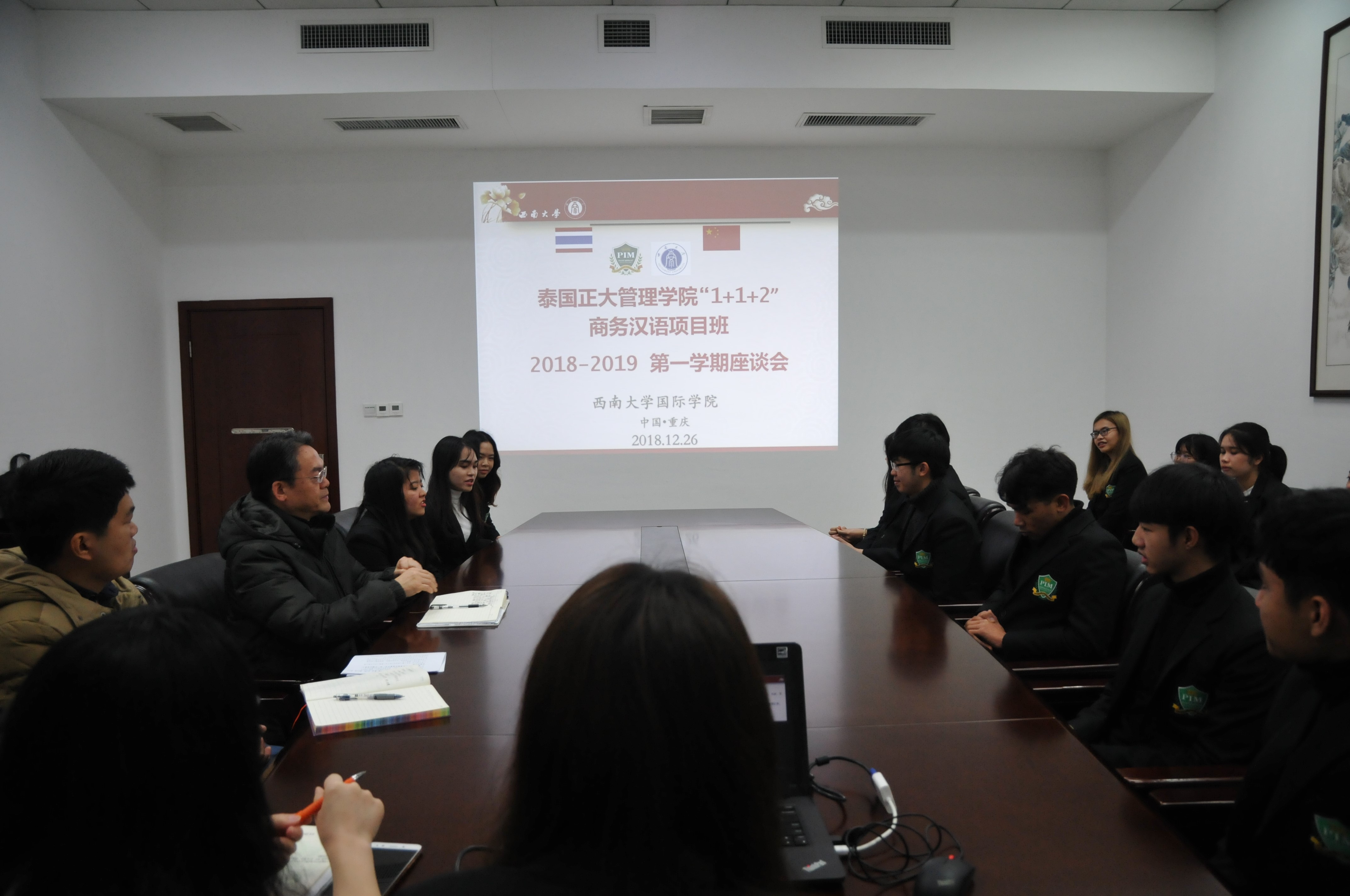 12月26日上午10:30,2018级泰国正大管理学院项目班师生期末座谈会在学院304会议室举行。党总支书记刘猛,学工办杨昆、任课教师代表林千彭,以及17名泰国学生参加会议,座谈会由班主任吴宗燕主持。