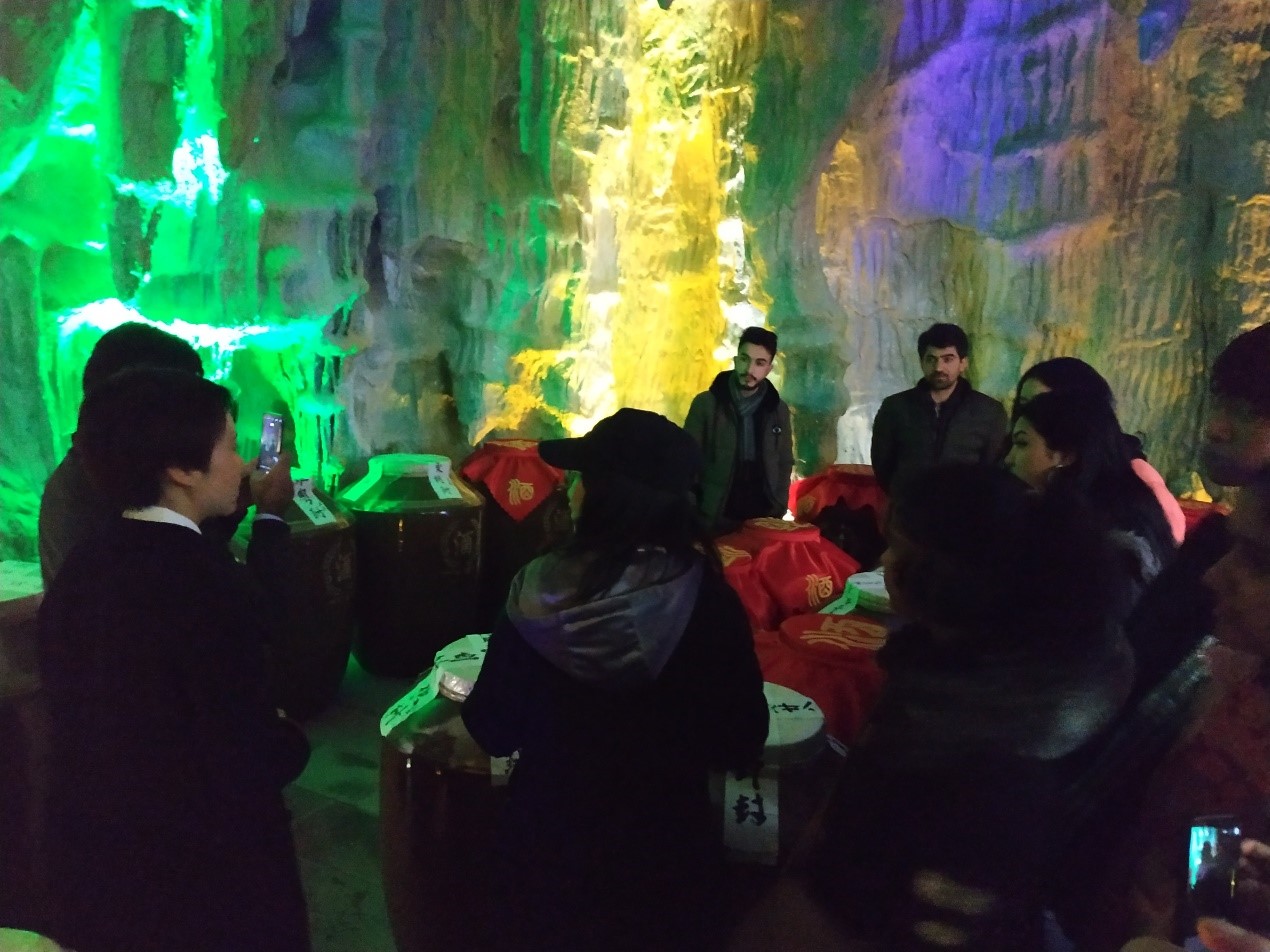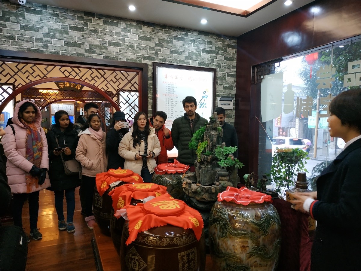随后,两个班的学生参观了储存酒的窑洞,看到一个个巨大的传统酒坛,闻到空气中弥漫的酒香味,巴基斯坦等国的同学陶醉于其中,戏说着想把酒窖搬回国。