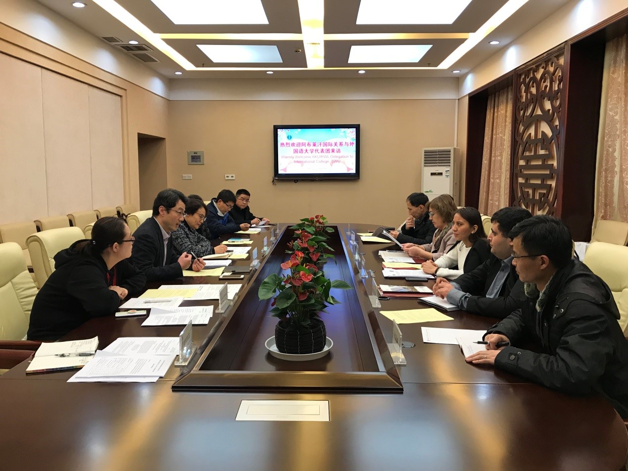 王静院长代表学院欢迎代表团一行来访并简要介绍了学院基本情况及两校合作开展情况。代表团成员、阿布莱汗国际关系与外国语大学国际合作资深专家SHAMILOV MURAD先生感谢王静院长及伟的国际1946bv的热情接待,并希望此次会谈能在推进两校合作方面取得良好效果。随后双方就国际经济与贸易、国际政治等联合培养专业的学制调整、课程对接、办学规模、经费办法、学位学历申请等方面举行了务实会谈。