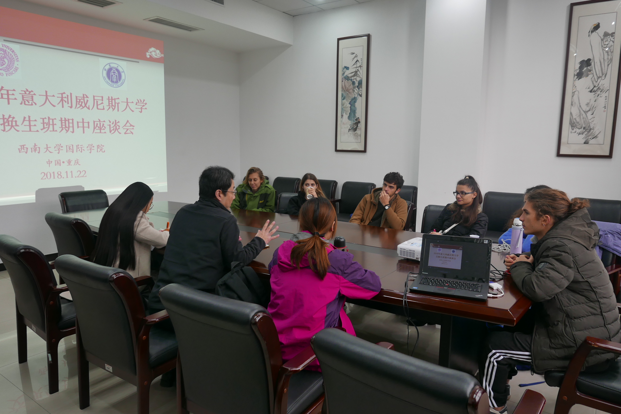 11月22日下午,意大利威尼斯大学交换生班期中座谈会在伟的国际1946bv紫云楼304会议室举行。副院长李航,教师代表王菁,以及2018年意大利威尼斯大学交换生班部分学生参加了本次座谈。会议由班主任刘妍芩主持。