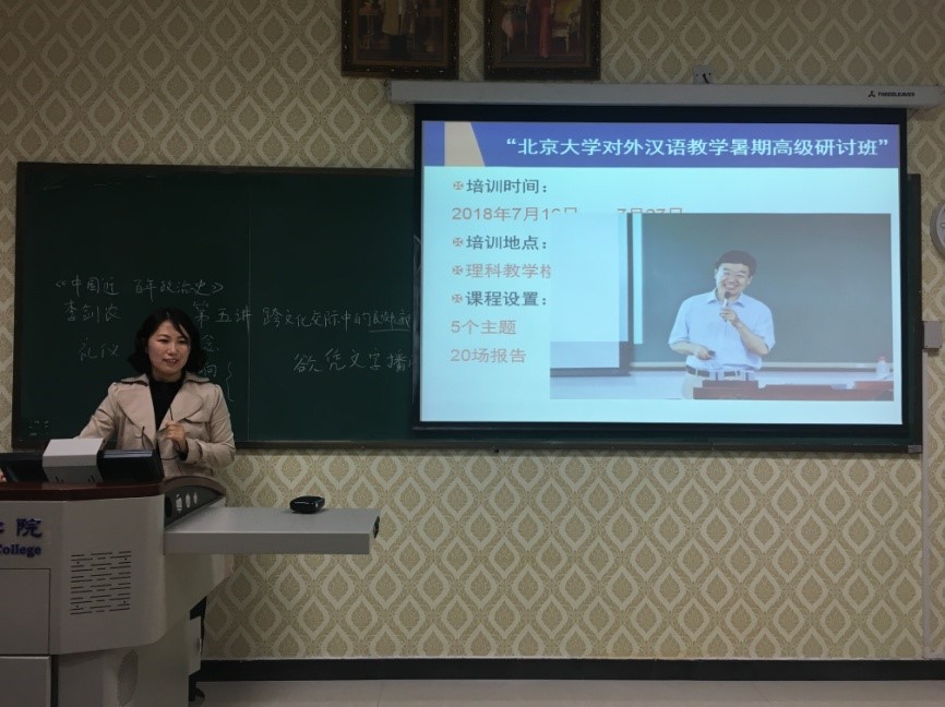 首先,路炜老师和大家交流了参加“北京大学对外汉语教学暑期高级研讨班”的收获。据悉,赵杨、刘珣、李泉等对外汉语界专家学者均在此次培训中授课,路老师表示专家们从不同的模块、不同的领域,以不同的角度和层面向我们传授知识、传递信息、传送经验,渊博的学识、活跃的思维、独到的见解、深入浅出的讲解,使她增长了见识,拓宽了视野,受益匪浅。全体教师围绕路老师的学习汇报内容进行了热烈的讨论。