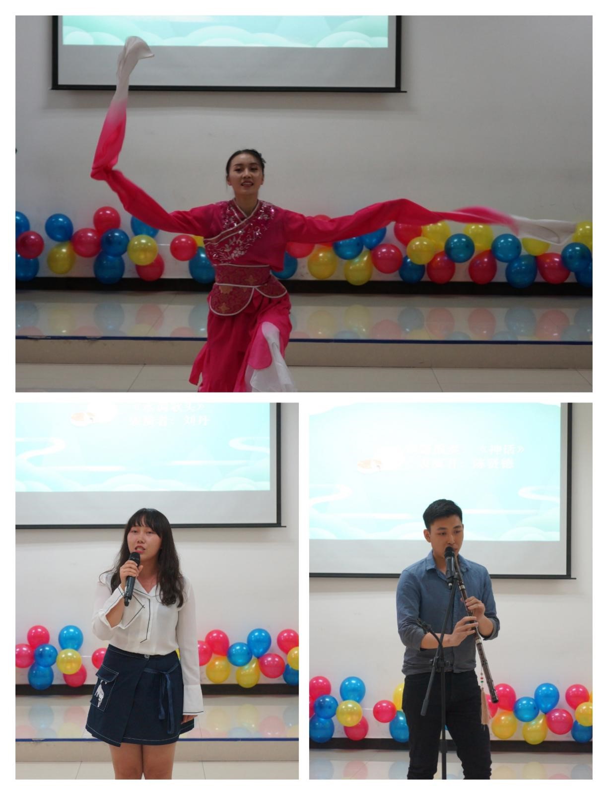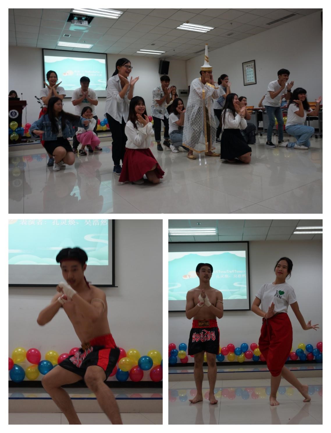 教师致辞之后,活动迎来了第一个精彩的节目,汉硕班学生刘丹伴着一首典雅的歌曲,向大家声情并茂地朗诵了苏轼的《水调歌头》,一句“但愿人长久,千里共婵娟”,让在场同学都置身于皓月当空 、孤高旷远的意境氛围中,无不心驰向往,思绪万千。紧接着,正大班全体学生为大家带来了具有浓浓泰国风情的歌舞表演,曾聪等同学身着泰国传统服装,向众人展示了泰国的服装文化。之后,汉硕班陈贤德同学倚歌而和,用中国传统乐器洞箫为大家吹奏了一曲《神话》,其声呜呜然,如怨如慕,如泣如诉,余音袅袅,不绝如缕,在场诸人无不沉醉其中;此外,汉硕班学生张祖瑶也为大家表演了古筝独奏《丰收锣鼓》,路丽帆同学以曼妙婀娜的舞姿为大家献上一曲《望月》,赢得了在场热烈的掌声。接着,泰国学生孔灵焕、吴浩然为大家带来了舞蹈和泰拳的表演,力量与柔美在这场表演中得到了完美的融合。