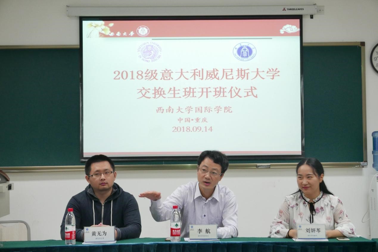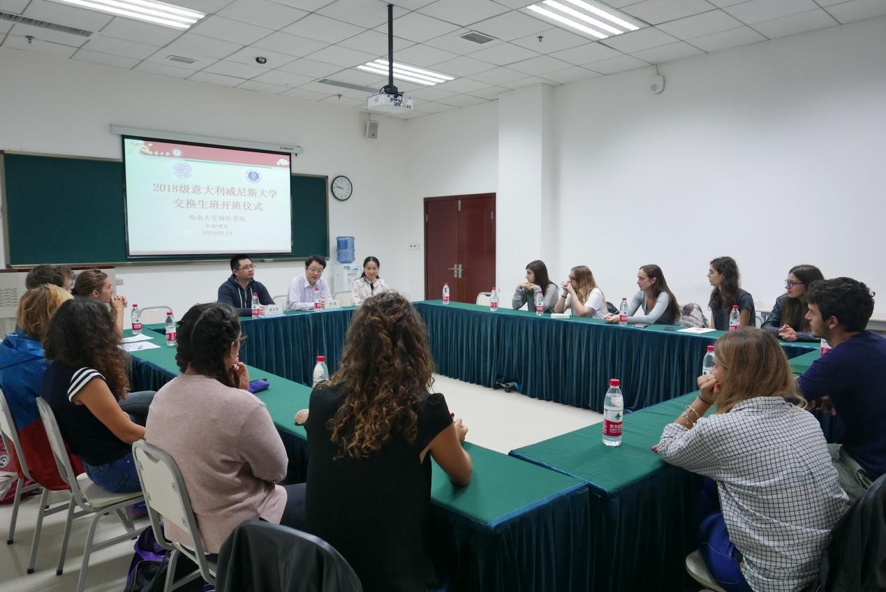 2018年9月14日上午8点50分,2018年意大利威尼斯大学交换生班开班仪式在伟的国际1946bv紫云楼312教室举行。伟的国际1946bv李航副院长,教学秘书杨凌霄老师,招生办公室黄无为老师,2018年意大利威尼斯大学交换生班新生参加了本次会议。会议由班主任刘妍芩主持。