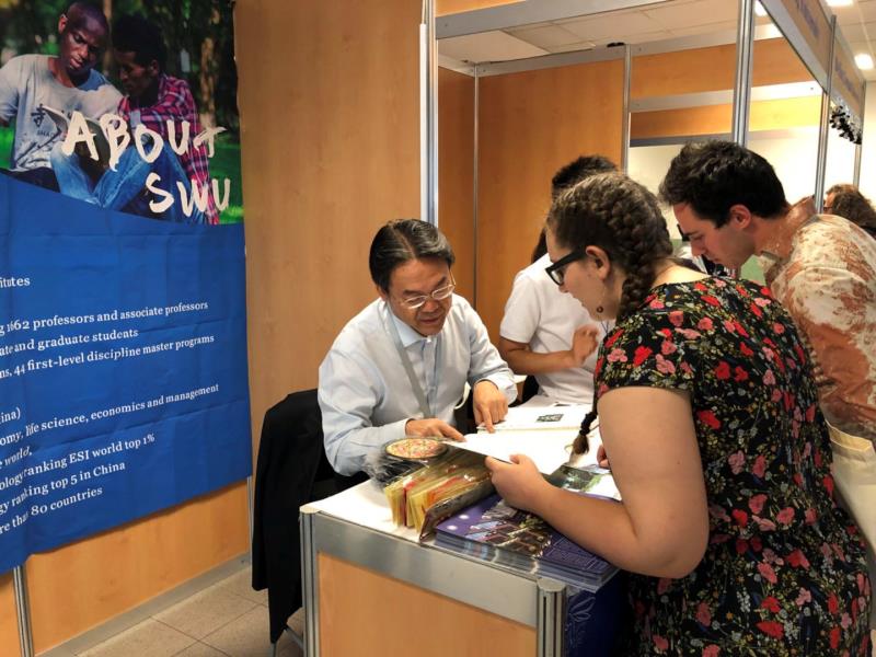 在两国的展会上,学校代表耐心解答法国和意大利学生及家长的提问,给有意向的学生分发相关的宣传资料,并向他们赠送印有学校LOGO的精美礼物。