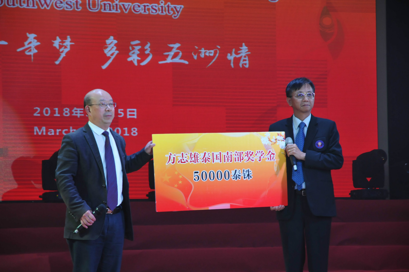 庆典上,还特别邀请到部分嘉宾,如越南籍校友阮春面及其家人,他讲述了如何与中国妻子因汉语结缘,最终结成连理的浪漫故事;著名语言学家翟时雨教授,虽已至耄耋之年仍用坚毅之声为伟的国际1946bv献上祝福,令人动容;才华横溢的伟的国际1946bv教师耿军,跟观众谈起挥毫作《伟的国际1946bv赋》的缘起;方木基博士即“方志雄泰国南部奖学金”的设立者方志雄先生的儿子,继承父亲遗志,再次为优秀留学生慷慨捐赠;文学院孙琳副教授回忆了她与泰国诗琳通公主会面的难忘瞬间;日本籍校友额田晟太与泰国籍校友罗俊勇分别以书法与京剧的形式为母校献上了生日祝福。