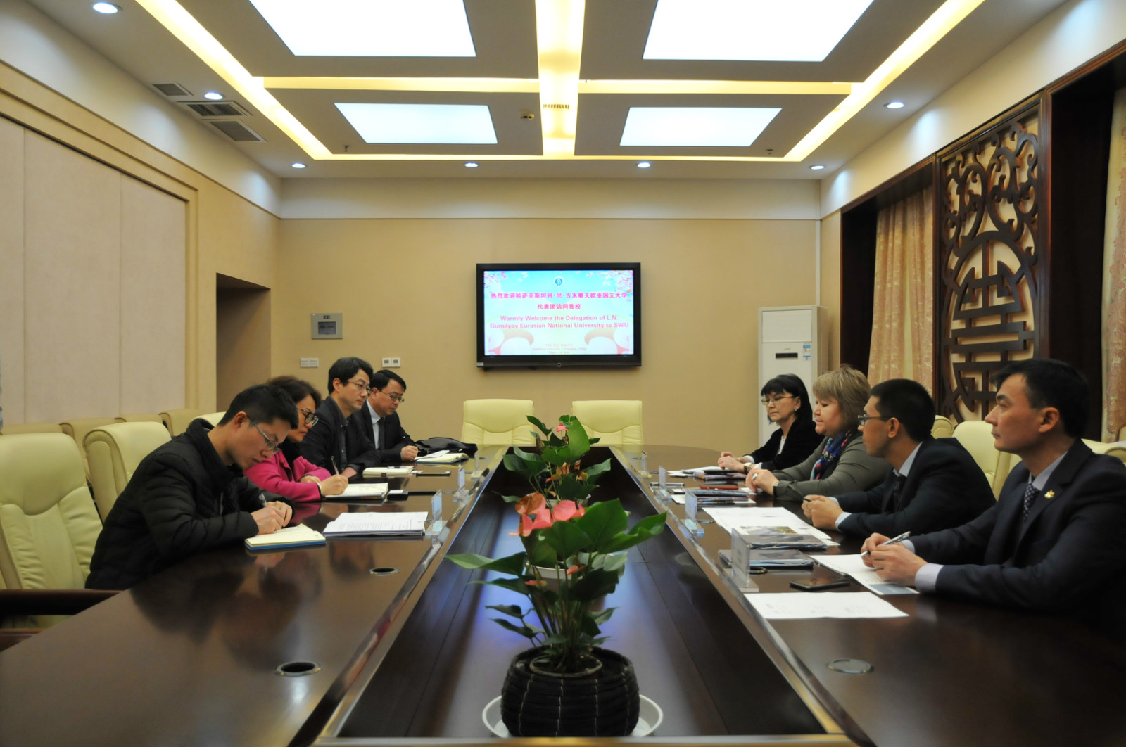 校长女士对王静院长的热情接待表达了诚挚感谢。她介绍了欧亚大学的基本情况,特别是该校的国际合作与交流情况。她表示,在中国“一带一路”建设的倡议下,欧亚大学正将国际交流合作的重心向中国转移。她希望双方在即将签署的合作备忘录框架下,就哈萨克斯坦文化研究中心、联合培养项目、科学研究等方面展开合作。