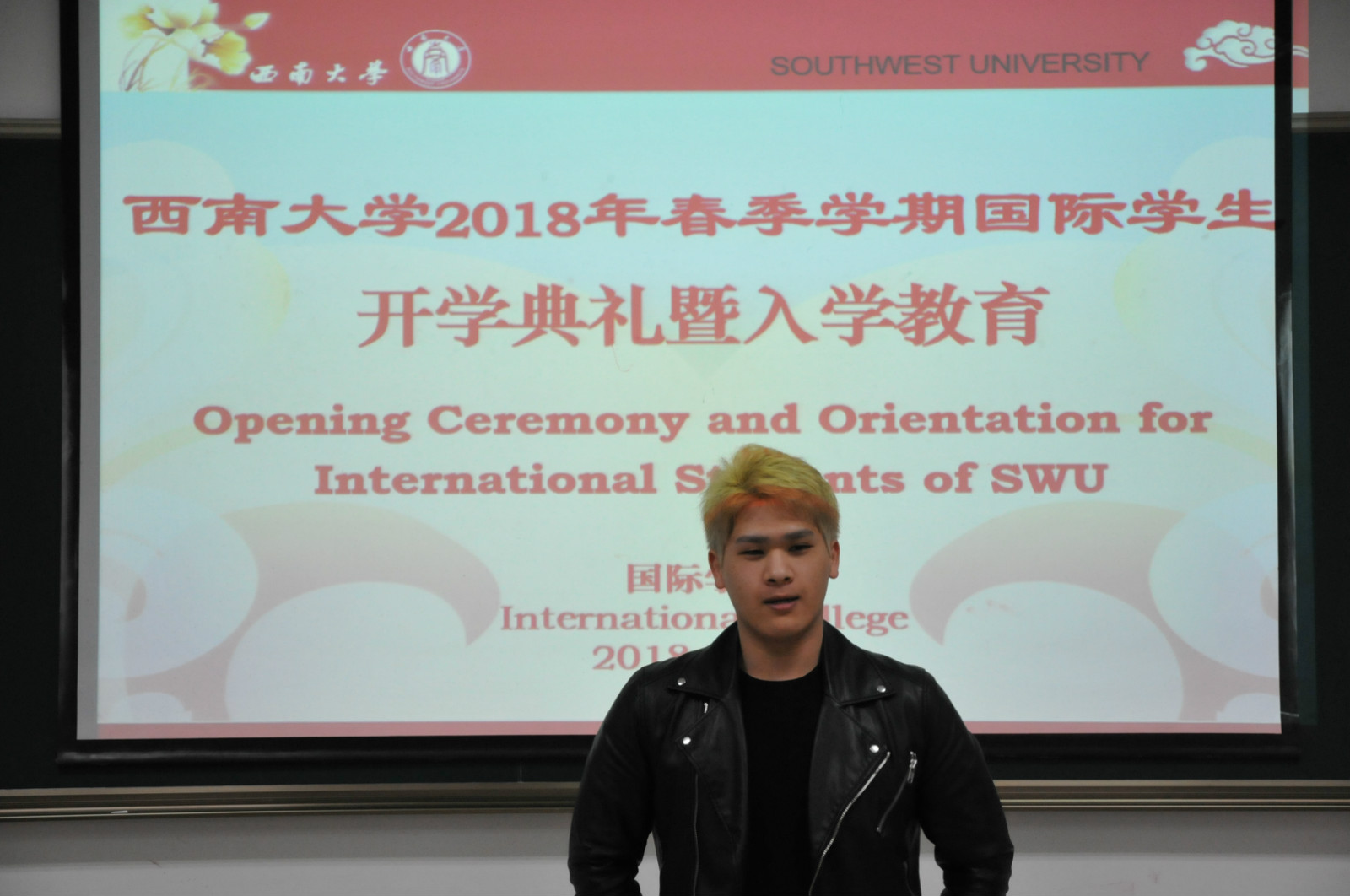 刘猛书记致辞。他热情欢迎大家来到美丽的校园,并介绍了学校独特的自然环境与人文资源及学校来华留学教育概况。他以“今天我以西大为荣,明天西大以我为骄傲”与新生共勉。